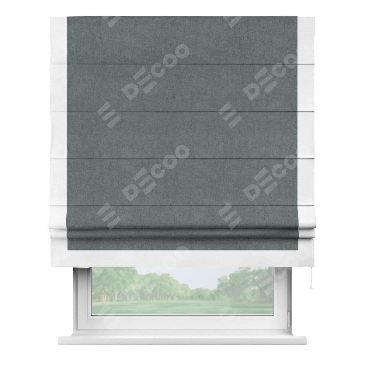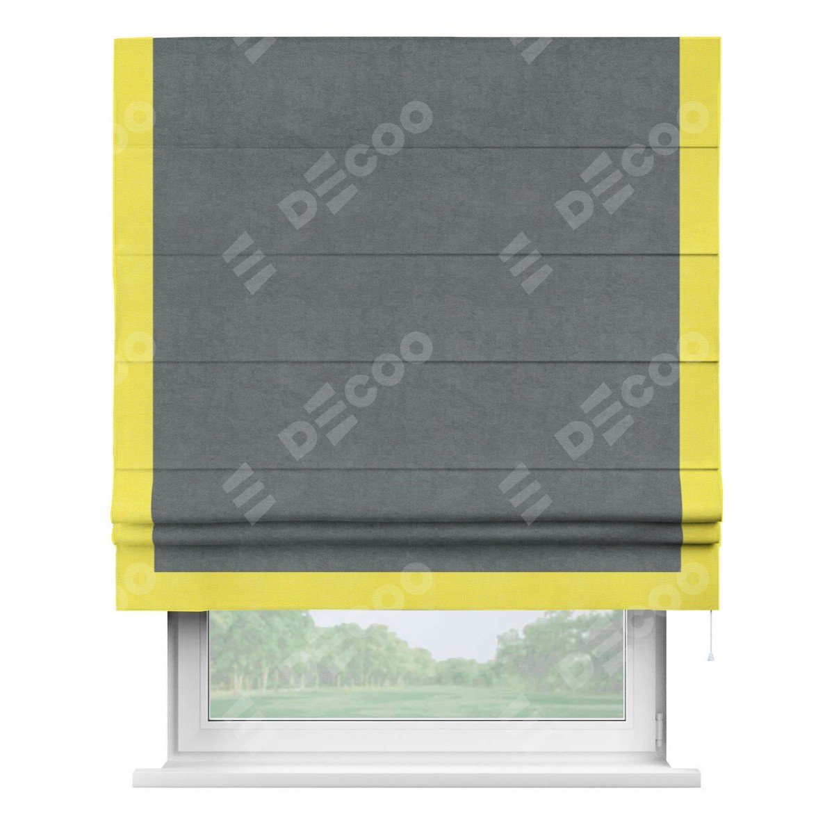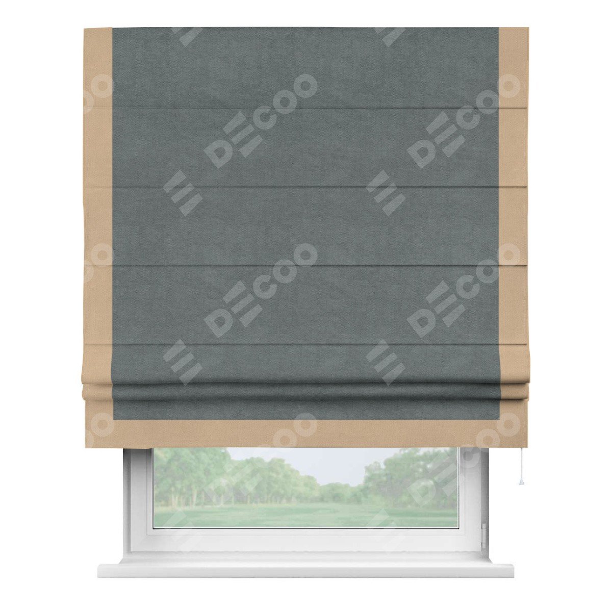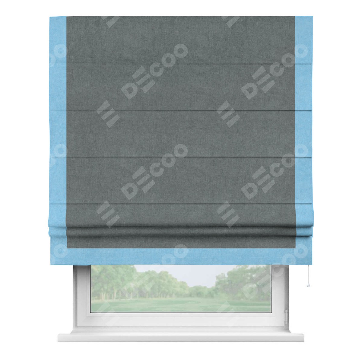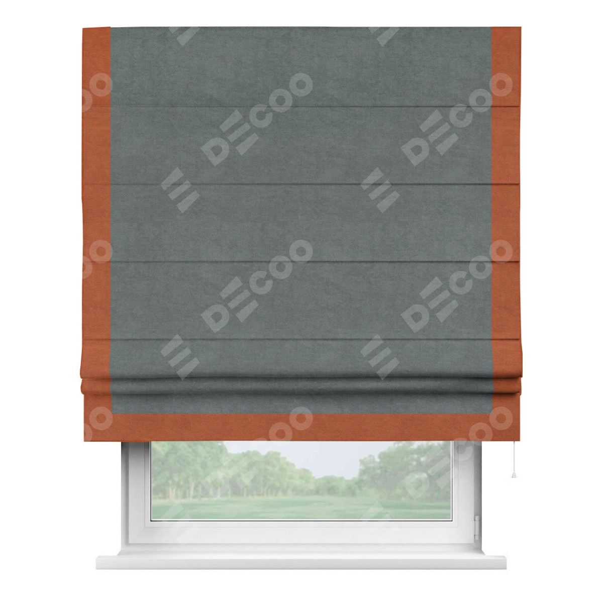 Римская штора производителя «Cortin», используется для проёма, пошита из ткани вельвет серый, артикул ткани 85542. Отделка шторы кантом «Виктория», ткань для канта используется из вельвета разной расцветки на выбор. Имеет универсальный механизм и подходит для монтажа: на потолок, на стену и в нишу.