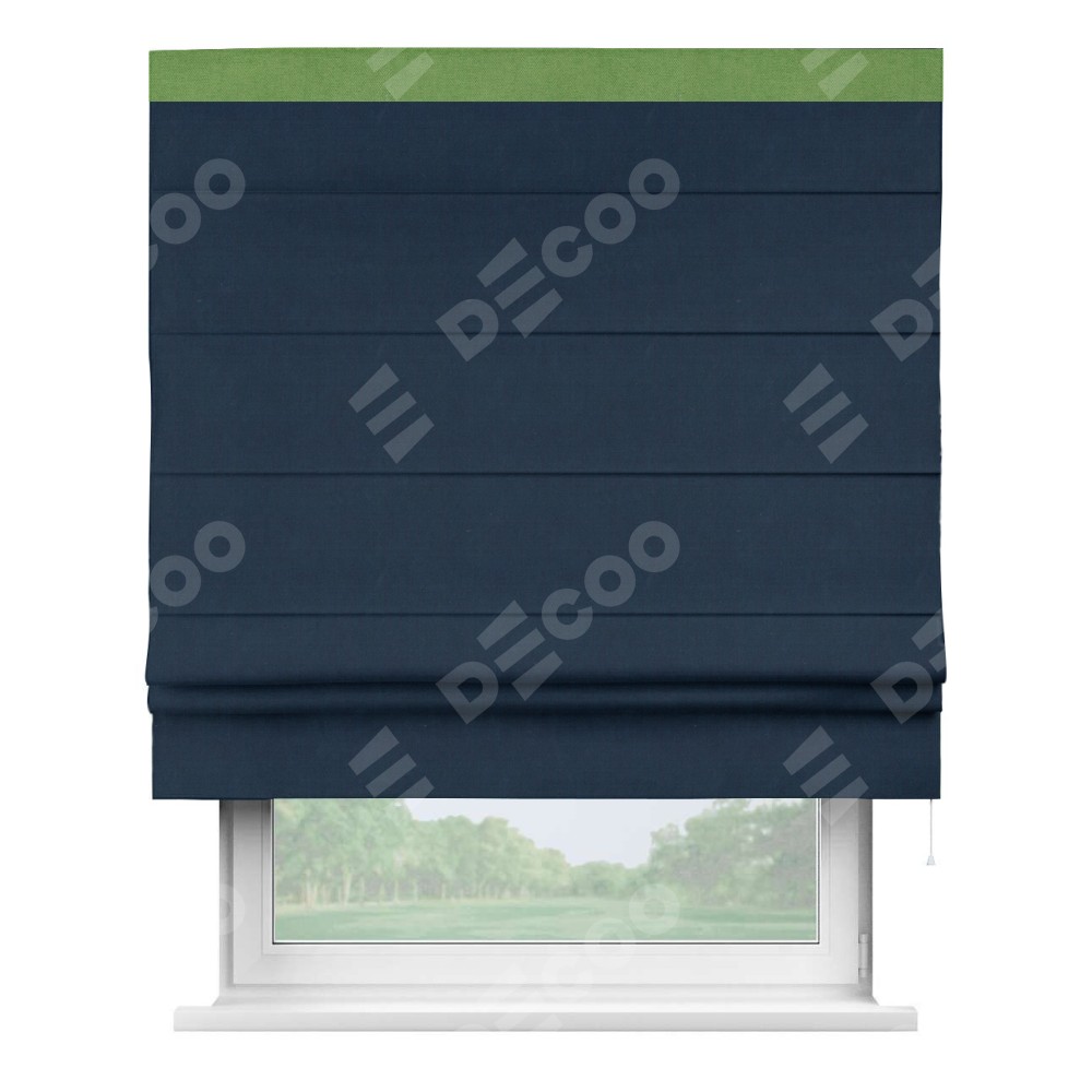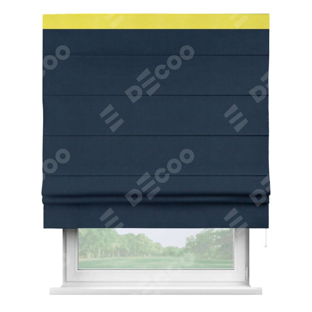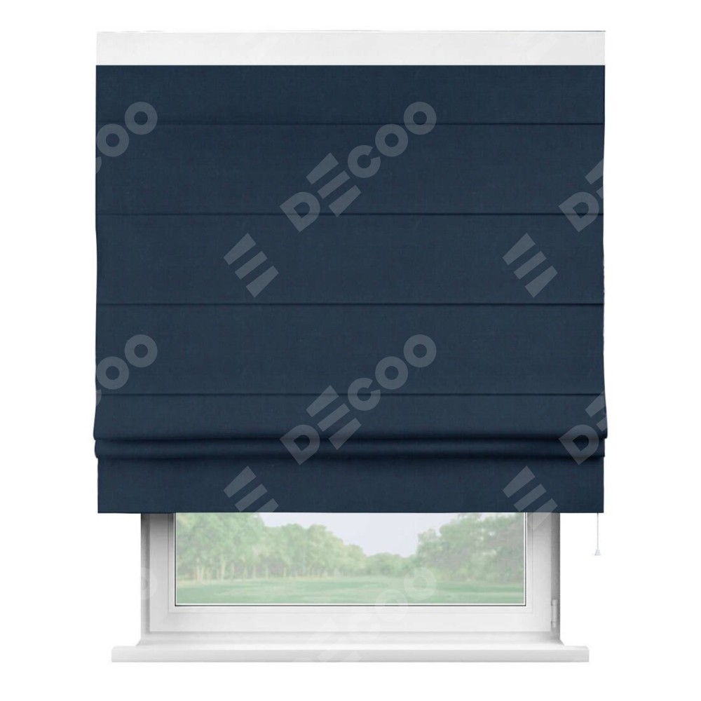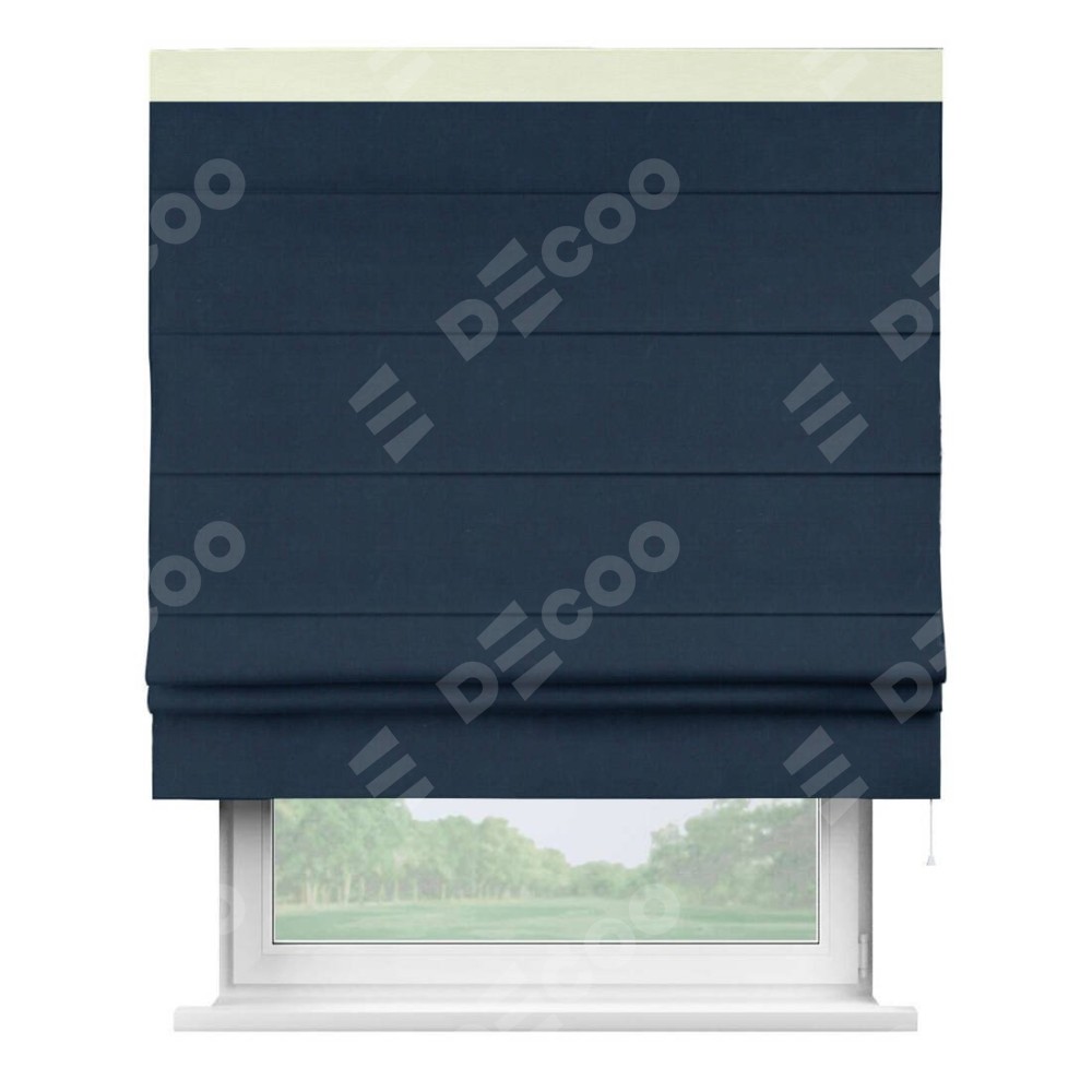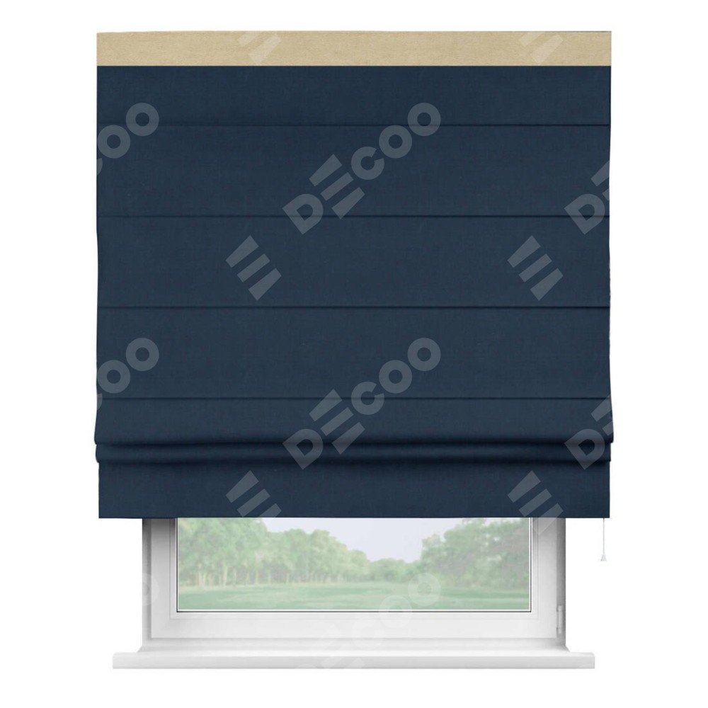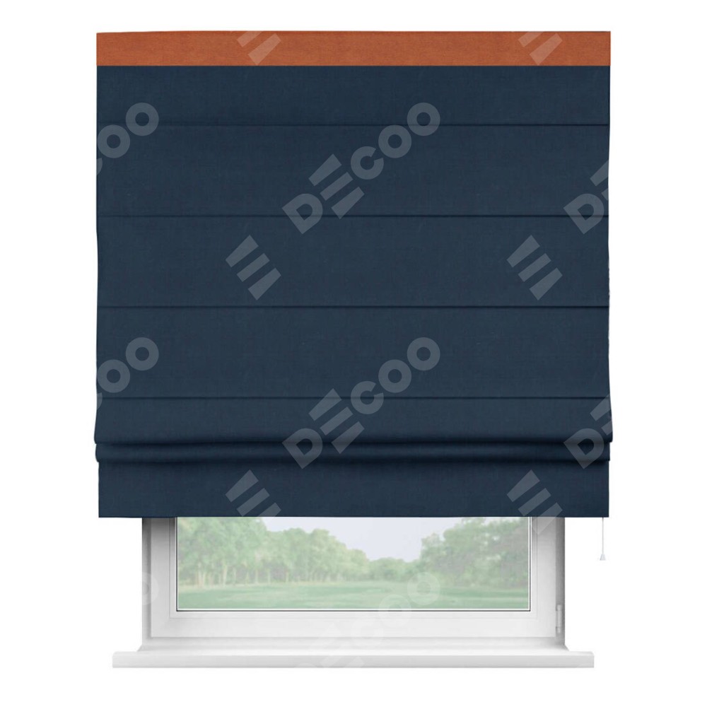 Римская штора производителя «Cortin», используется для проёма, пошита из ткани вельвет темно-синий, артикул ткани 14152. Отделка шторы кантом «Кинг», ткань для канта используется из вельвета разной расцветки на выбор. Имеет универсальный механизм и подходит для монтажа: на потолок, на стену и в нишу.