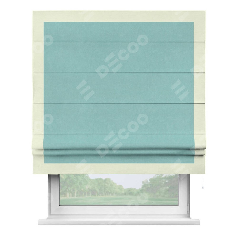 Римская штора производителя «Cortin», используется для проёма, пошита из ткани вельвет тиффани, артикул ткани 17765. Отделка шторы кантом «Чесс», ткань для канта используется из вельвета разной расцветки на выбор. Имеет универсальный механизм и подходит для монтажа: на потолок, на стену и в нишу.