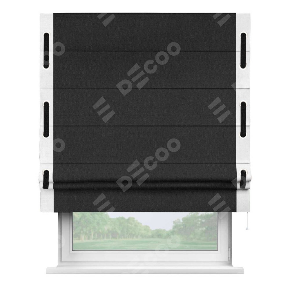 Римская штора производителя «Cortin», используется для проёма, пошита из ткани лён черный, артикул 85927. Отделка шторы кантом «Стрим Дуо» на кантах расположены люверсы с пояском, ткань для канта используется из льна разной расцветки на выбор. Ткань для пояска обычно используется из основной ткани шторы, а так же можно сделать из любой расцветки по желанию. Имеет универсальный механизм и подходит для монтажа: на потолок, на стену и в нишу.