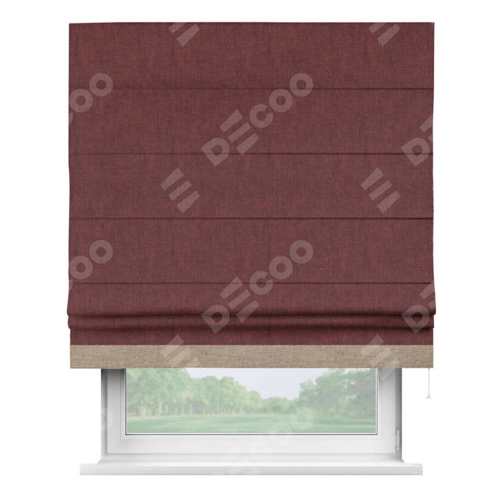 Римская штора производителя «Cortin», используется для проёма, пошита из ткани лён кашемир бордовый, артикул 17213. Отделка шторы кантом «Джестер», ткань для канта используется из льна разной расцветки на выбор. Имеет универсальный механизм и подходит для монтажа: на потолок, на стену и в нишу.