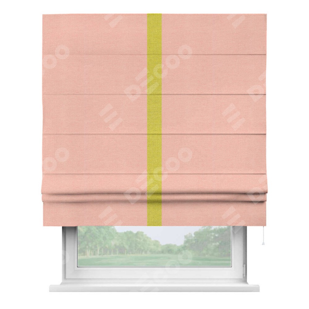 Римская штора производителя «Cortin», используется для проёма, пошита из ткани лён розовый, артикул 00005. Отделка шторы кантом «Хайвэй», ткань для канта используется из льна разной расцветки на выбор. Имеет универсальный механизм и подходит для монтажа: на потолок, на стену и в нишу.