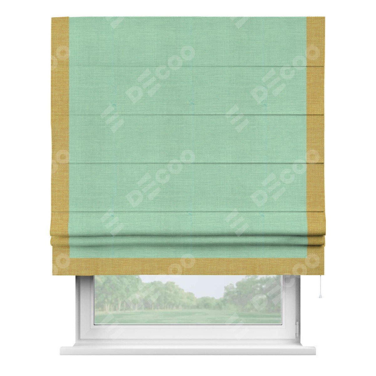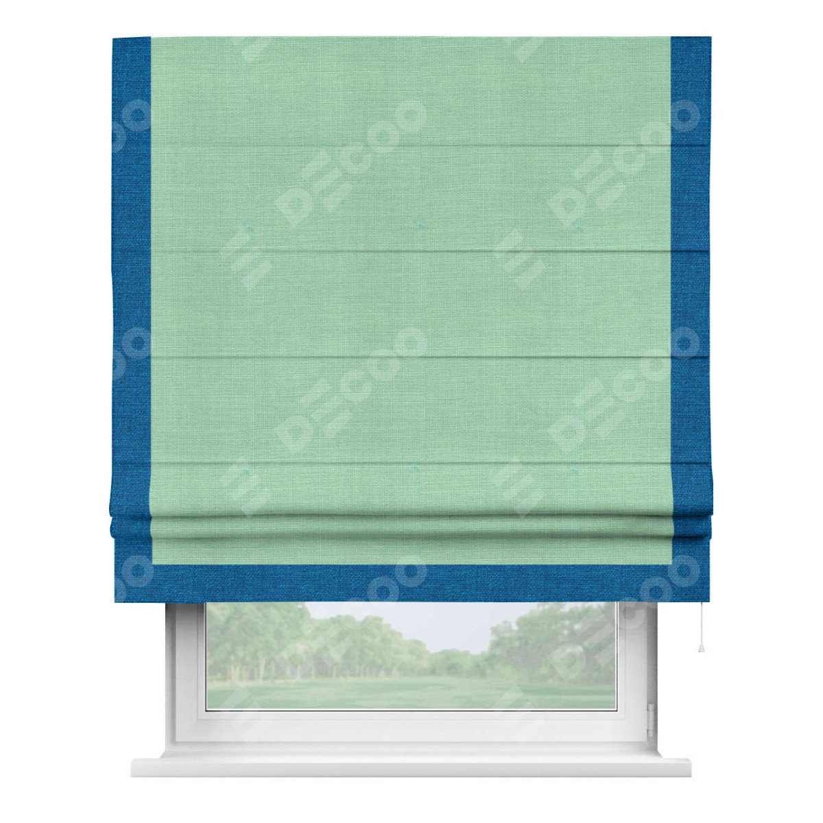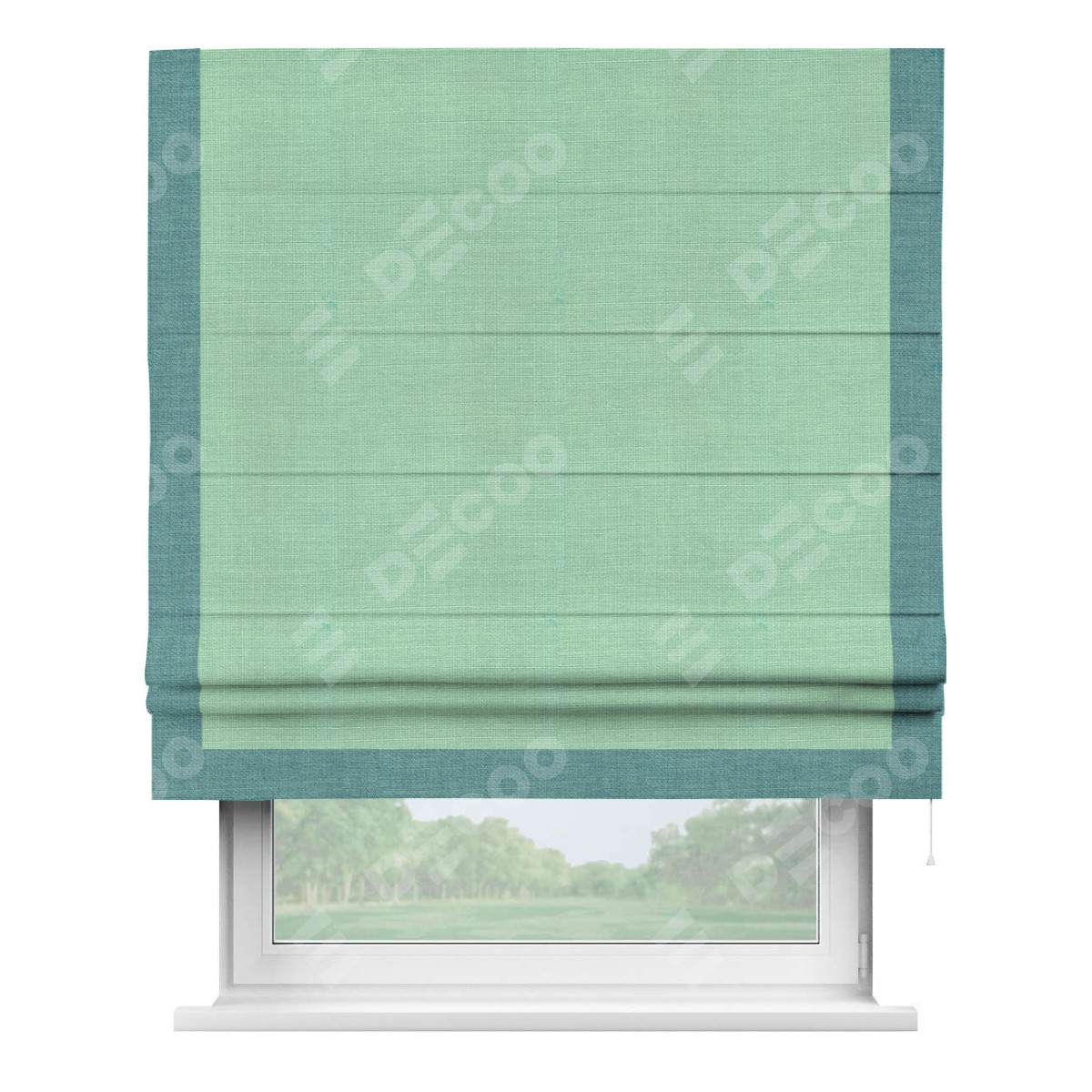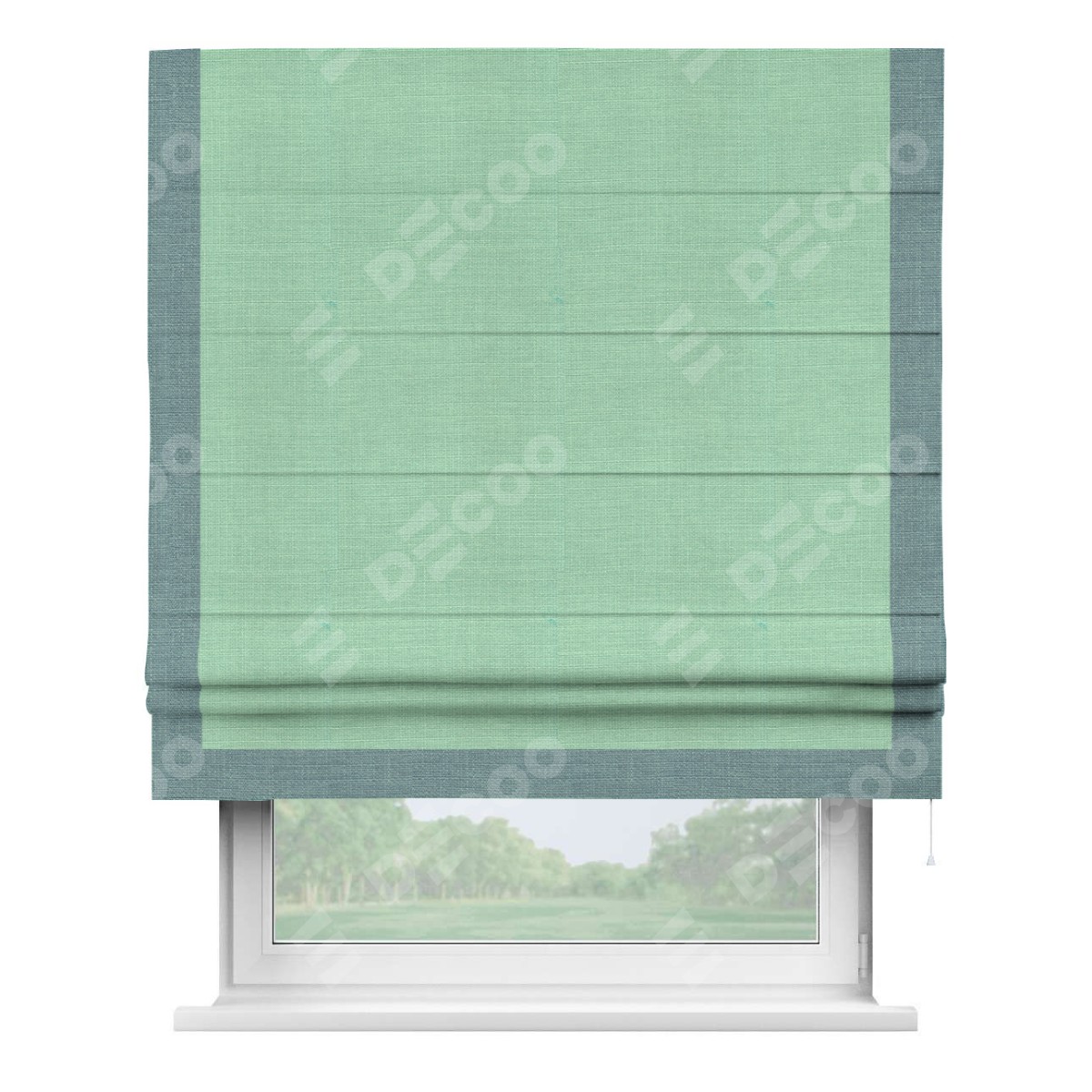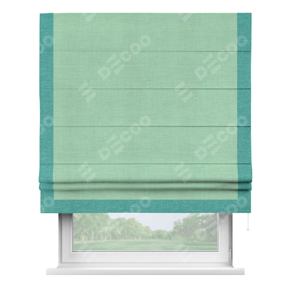 Римская штора производителя «Cortin», используется для проёма, пошита из ткани лён светло-бирюзовый, артикул 74737. Отделка шторы кантом «Виктория», ткань для канта используется из льна разной расцветки на выбор. Имеет универсальный механизм и подходит для монтажа: на потолок, на стену и в нишу.