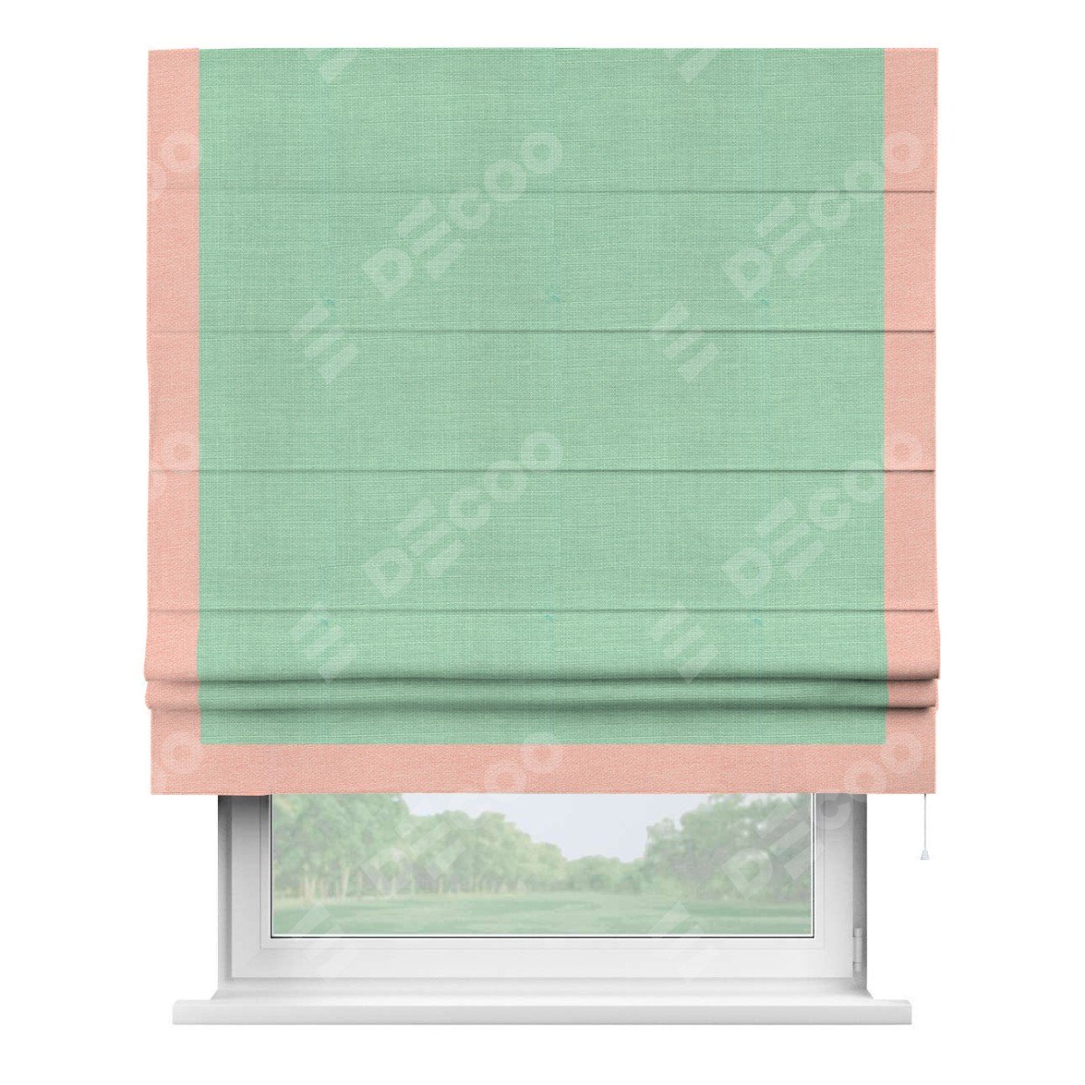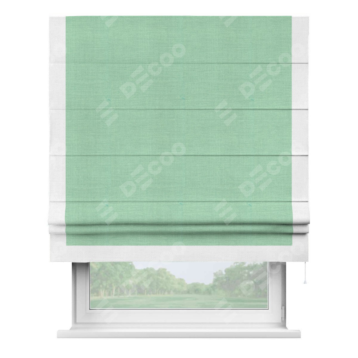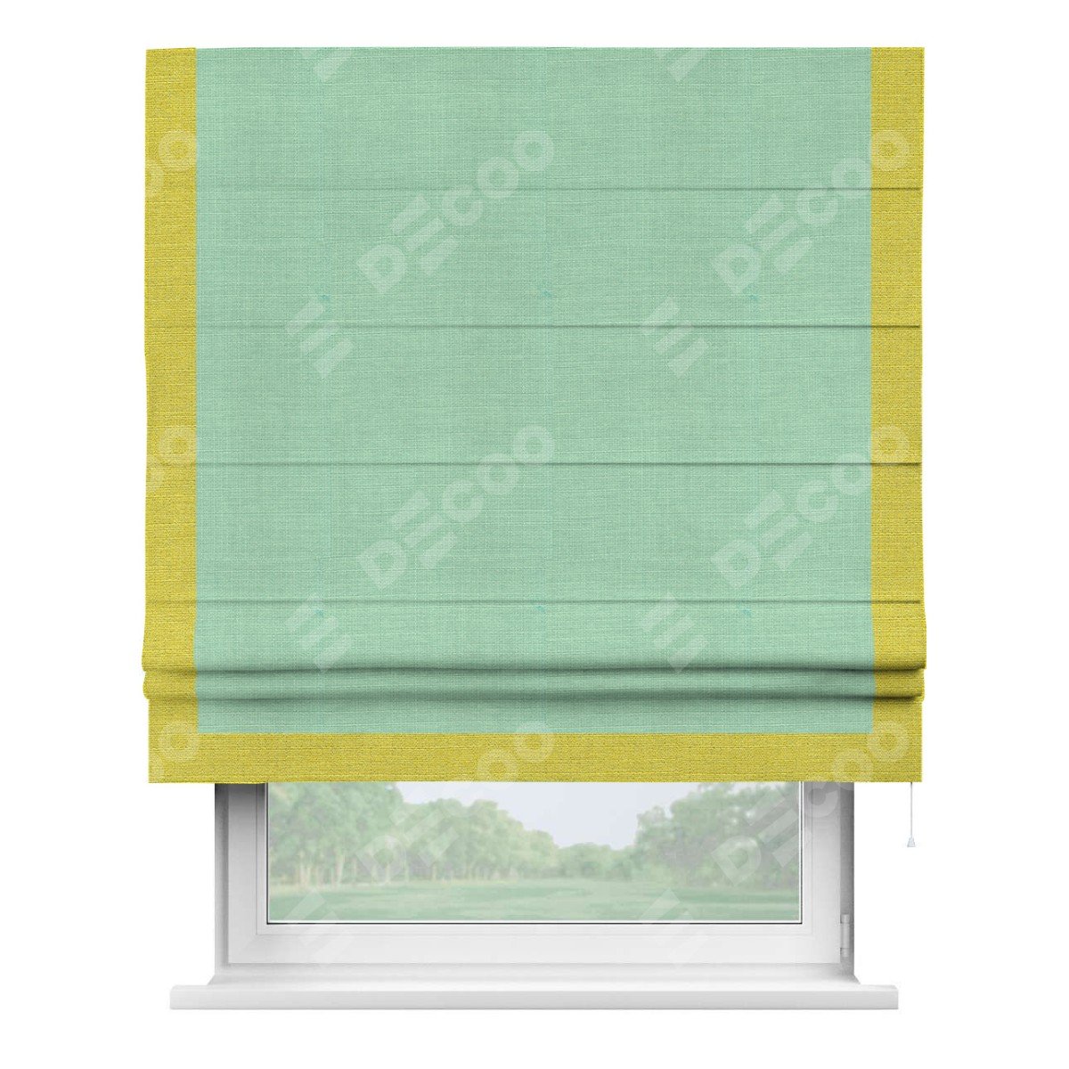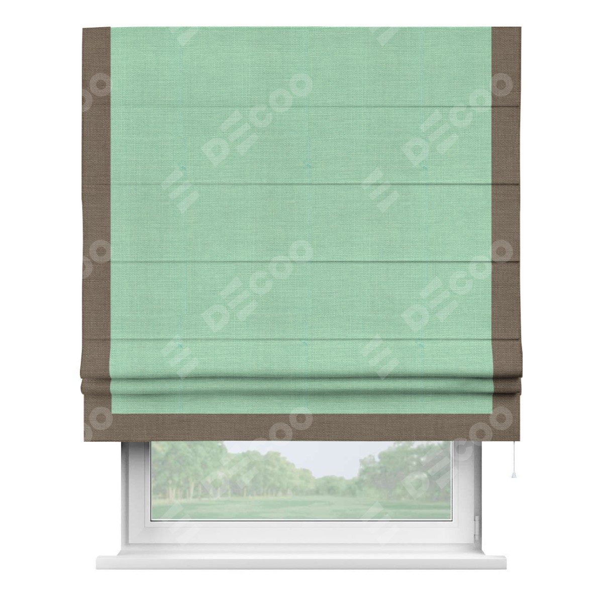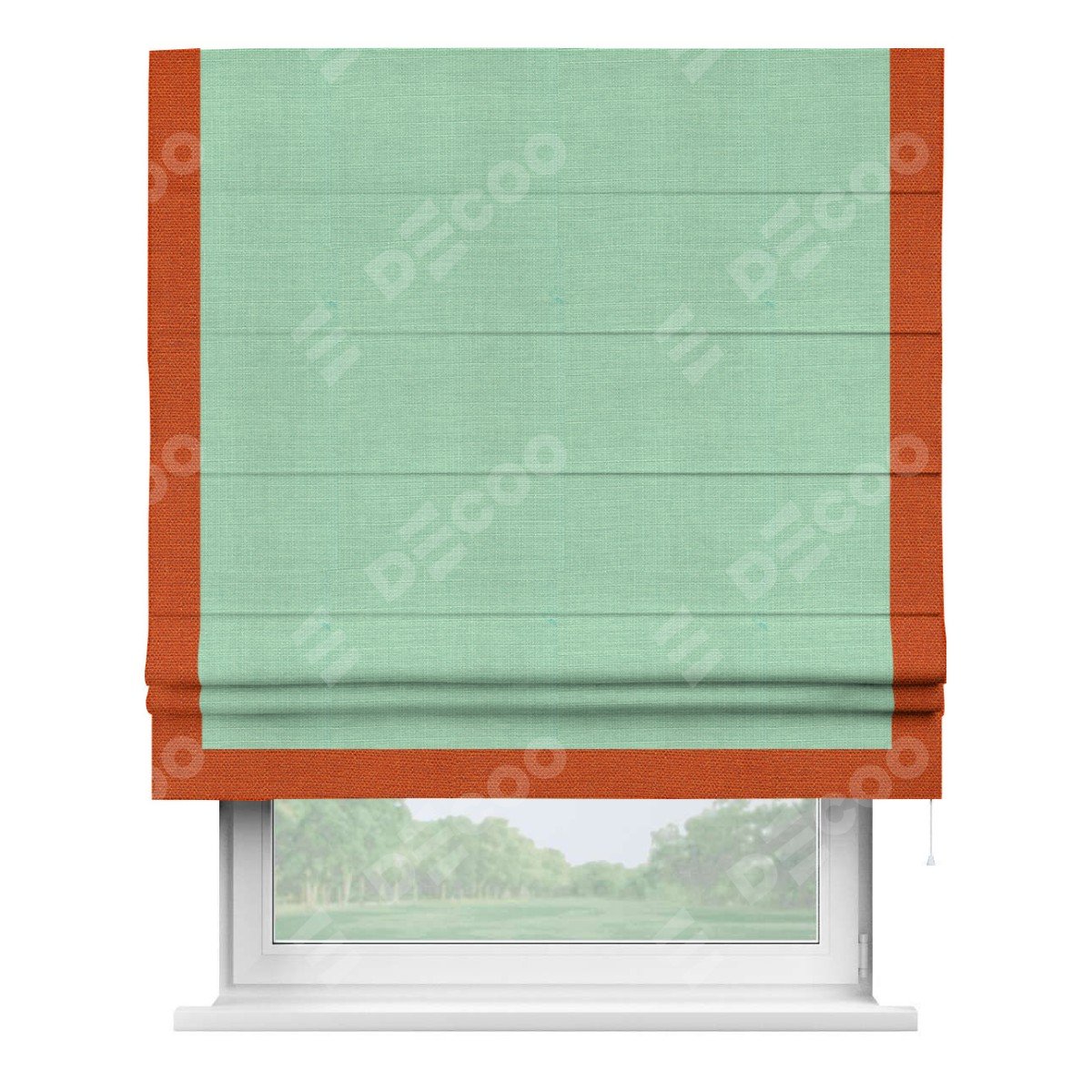 Римская штора производителя «Cortin», используется для проёма, пошита из ткани лён светло-бирюзовый, артикул 74737. Отделка шторы кантом «Виктория», ткань для канта используется из льна разной расцветки на выбор. Имеет универсальный механизм и подходит для монтажа: на потолок, на стену и в нишу.