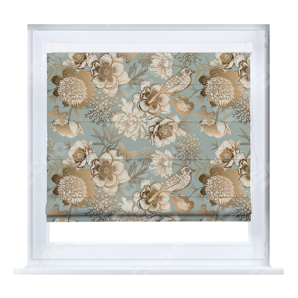 Римская штора кассетного типа, производителя «Cortin», устанавливается только на пластиковые окна и прилегает к стеклопакету, пошита из ткани блэкаут с нанесением сублимационной печати «Садовые цветы».