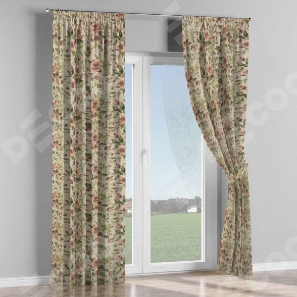 Комплект прямых штор, от производителя «Cortin», пошиты из ткани «Розы бежевые», артикул ткани 34564. С изнаночной стороны в верхней части штор пристрачивается шторная лента с декоративными складками «Карандаш». Для создания элегантных складок прямые шторы шьются по стандарту с коэффициентом 1:2 (на 100 см. ширины проёма 200 см. ширины ткани).