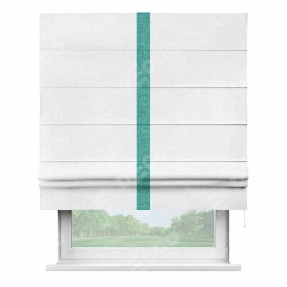 Римская штора производителя «Cortin», используется для проёма, пошита из ткани лён белоснежный, артикул 7438. Отделка шторы кантом «Хайвэй», ткань для канта используется из льна разной расцветки на выбор. Имеет универсальный механизм и подходит для монтажа: на потолок, на стену и в нишу.