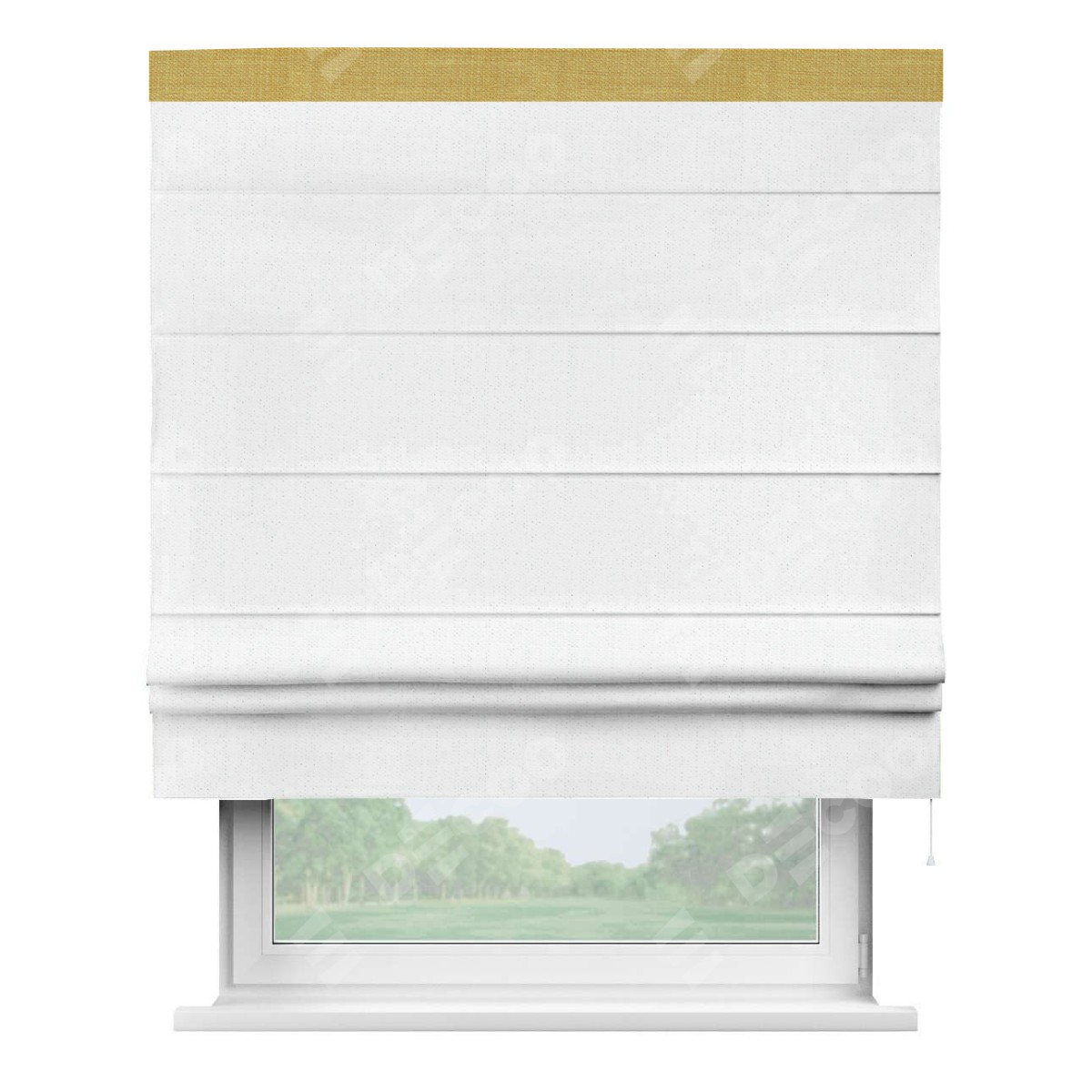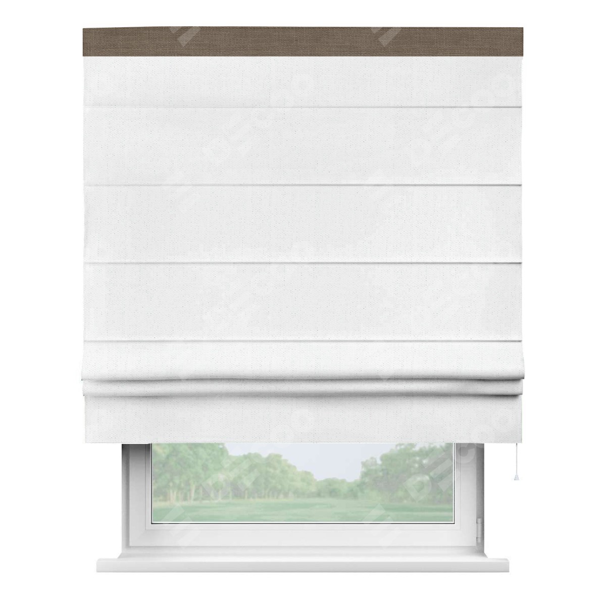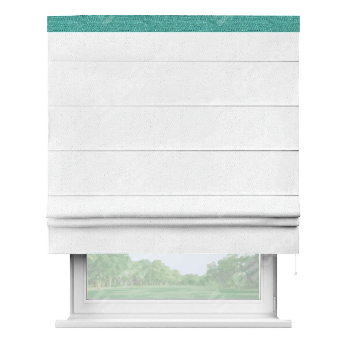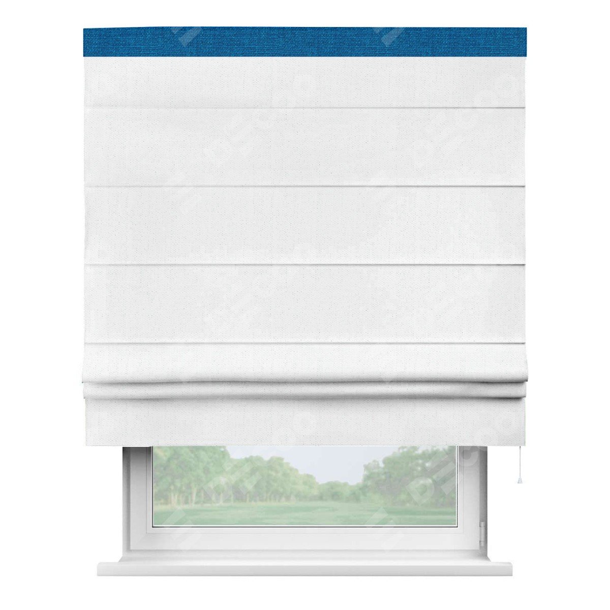 Римская штора производителя «Cortin», используется для проёма, пошита из ткани лён белоснежный, артикул 7438. Отделка шторы кантом «Кинг», ткань для канта используется из льна разной расцветки на выбор. Имеет универсальный механизм и подходит для монтажа: на потолок, на стену и в нишу.