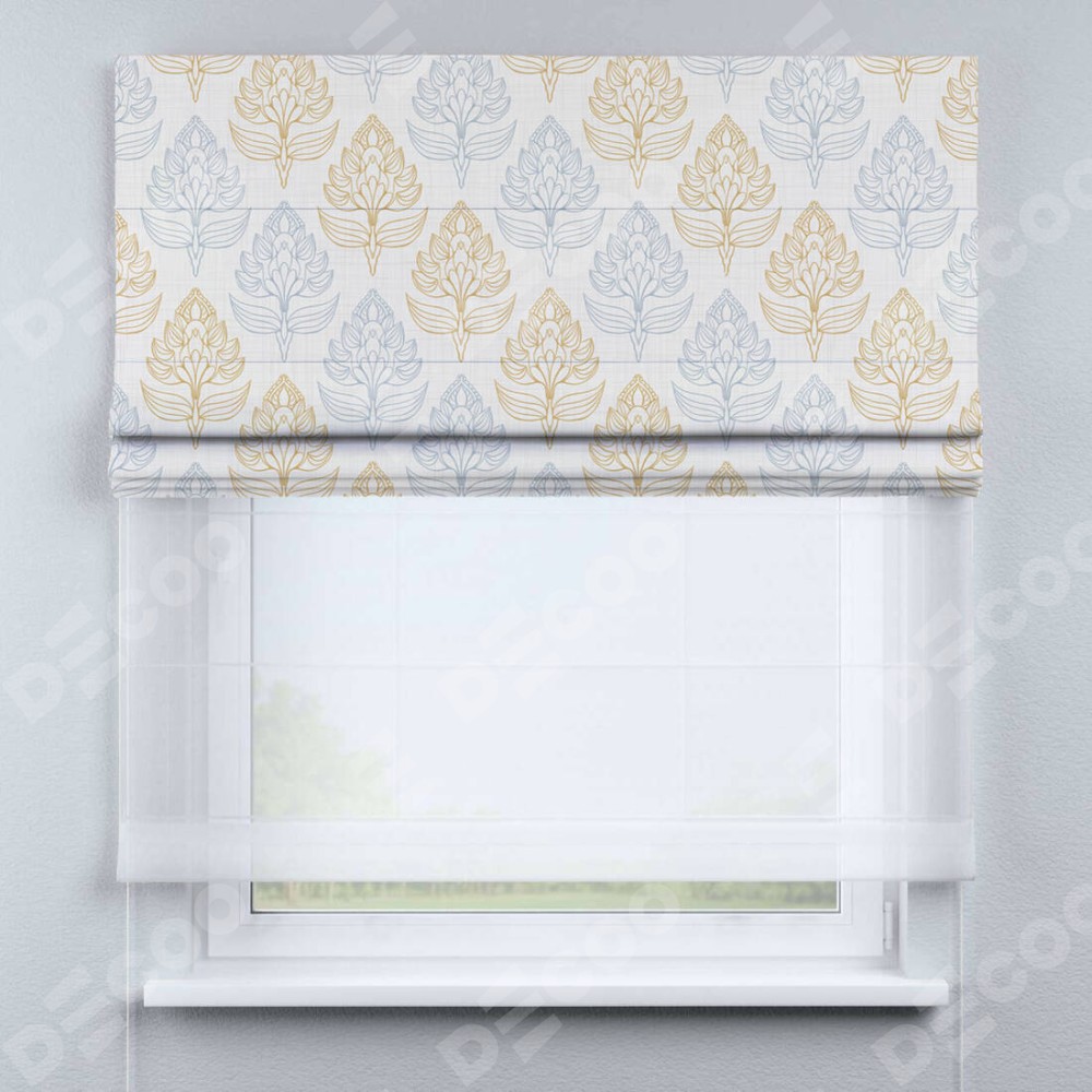 Римская штора день-ночь производителя «Cortin», используется для проёма, пошита из двух полотен, с лицевой блэкаут с нанесением сублимационной печати «Цветочный медальон», вторая ткань тюль (по стандарту комплектуется тюль белого цвета артикул V-01). Имеет универсальный механизм и подходит для монтажа: на потолок, на стену и в нишу.