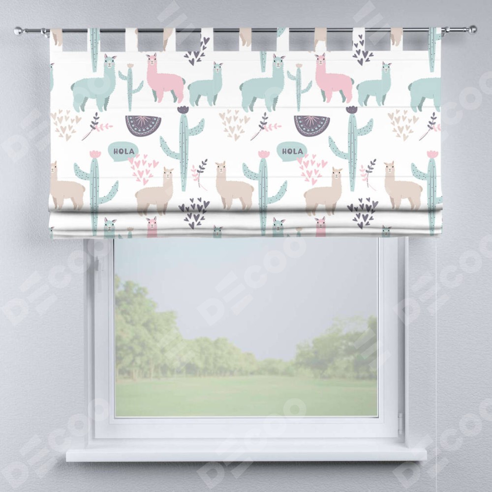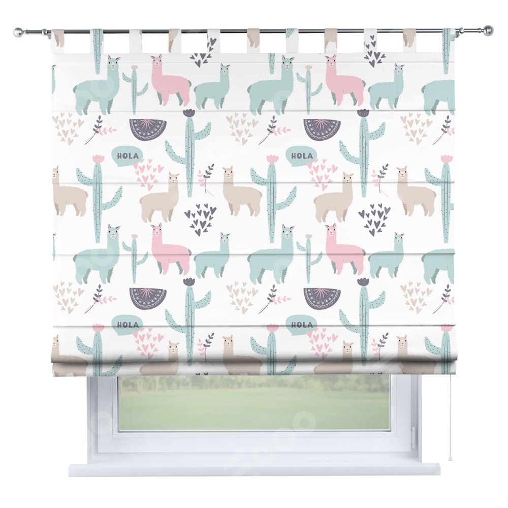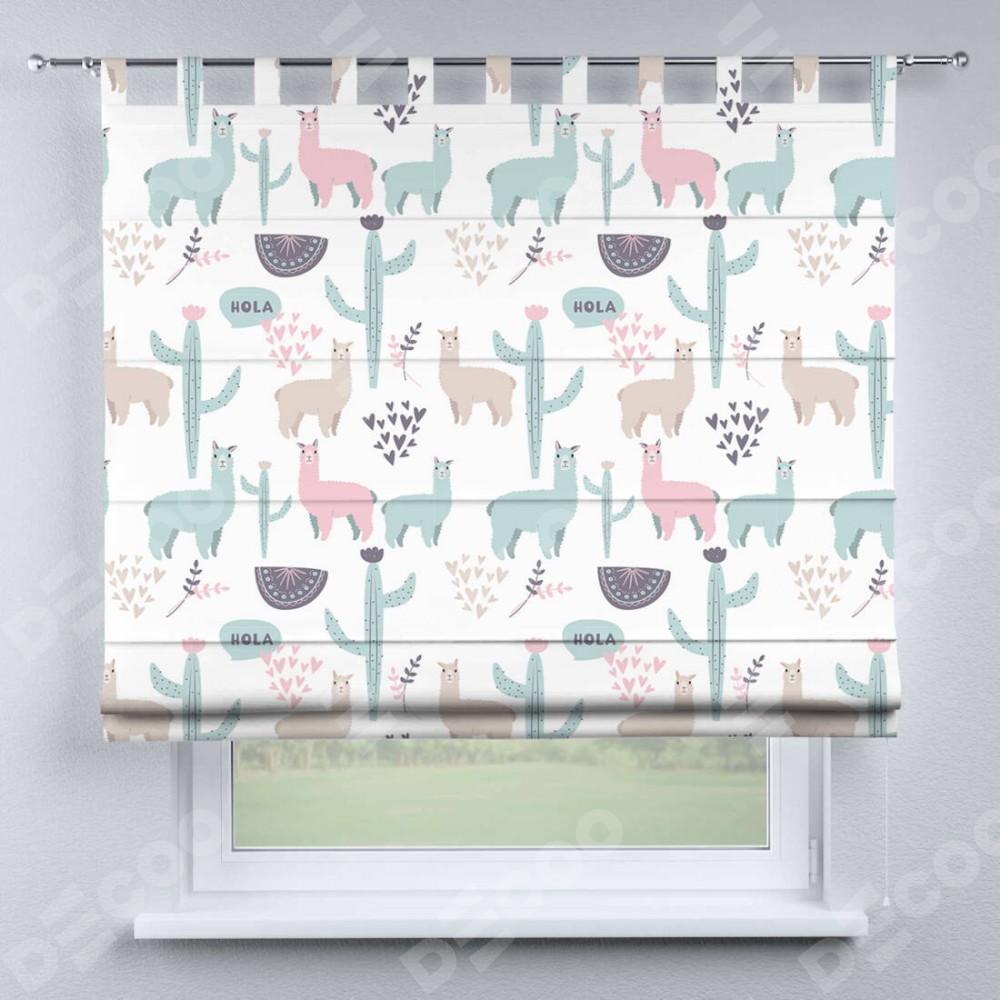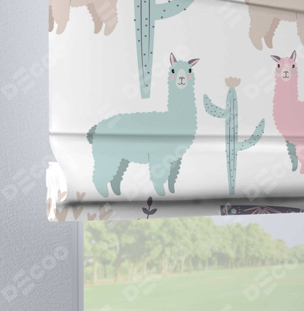 Римская штора производителя «Cortin», используется для проёма, пошита из ткани блэкаут с нанесением сублимационной печати «Милый лама». Данная модель пошита на петлях, комплектуется на выбор круглым карнизом и подходит для монтажа на стену. Римская штора на петлях имеет простую систему регулировки высоты, отличительным преимуществом данной модели является простой способ монтажа. Достаточно повесить ее на трубу и штора готова!
