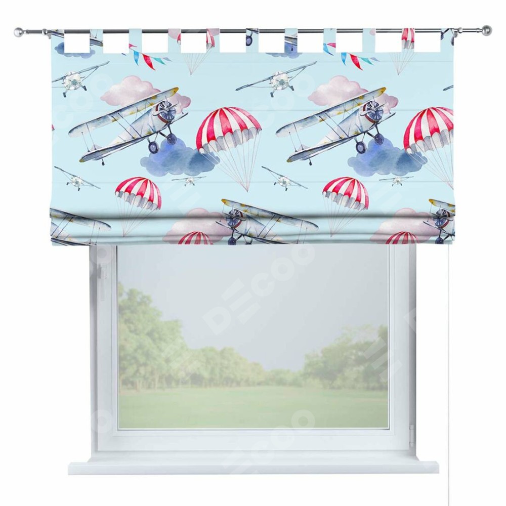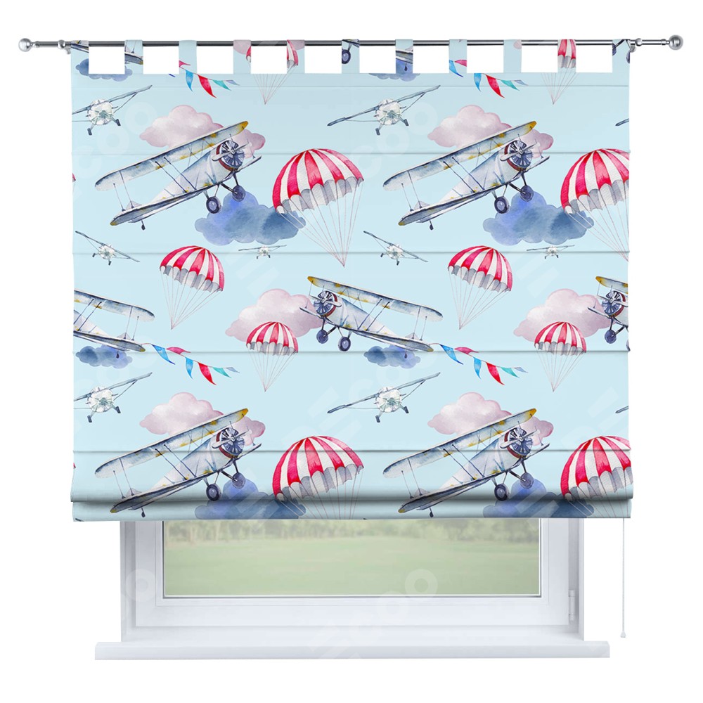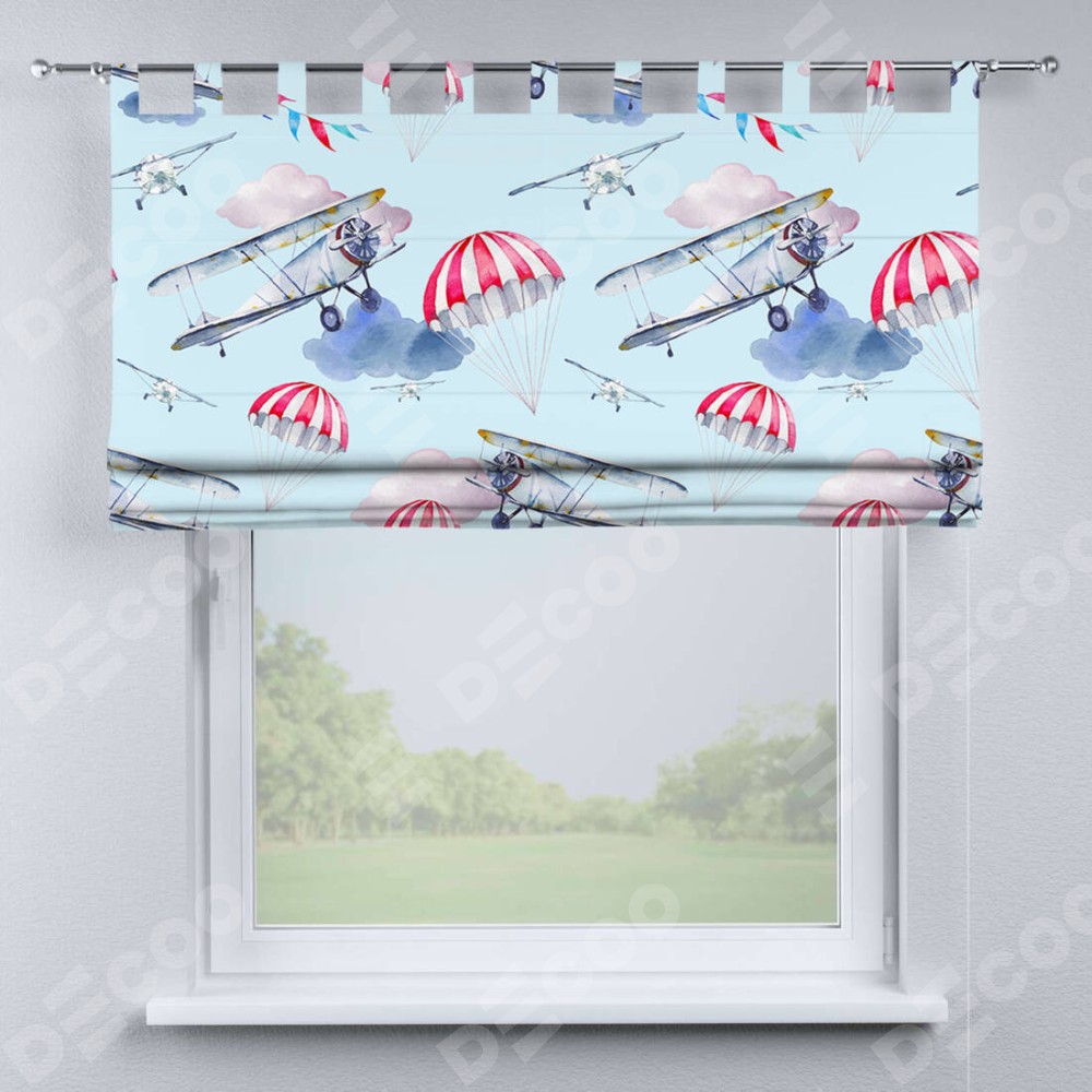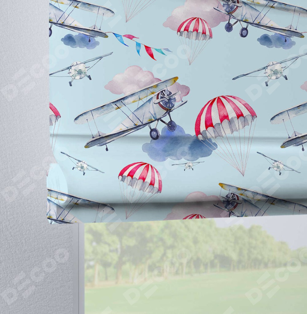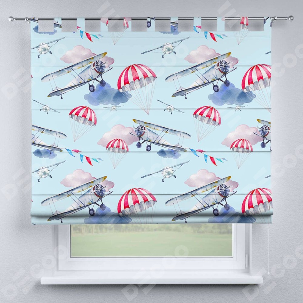 Римская штора производителя «Cortin», используется для проёма, пошита из ткани блэкаут с нанесением сублимационной печати «Самолет». Данная модель пошита на петлях, комплектуется на выбор круглым карнизом и подходит для монтажа на стену. Римская штора на петлях имеет простую систему регулировки высоты, отличительным преимуществом данной модели является простой способ монтажа. Достаточно повесить ее на трубу и штора готова!