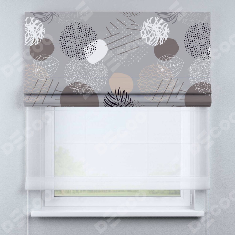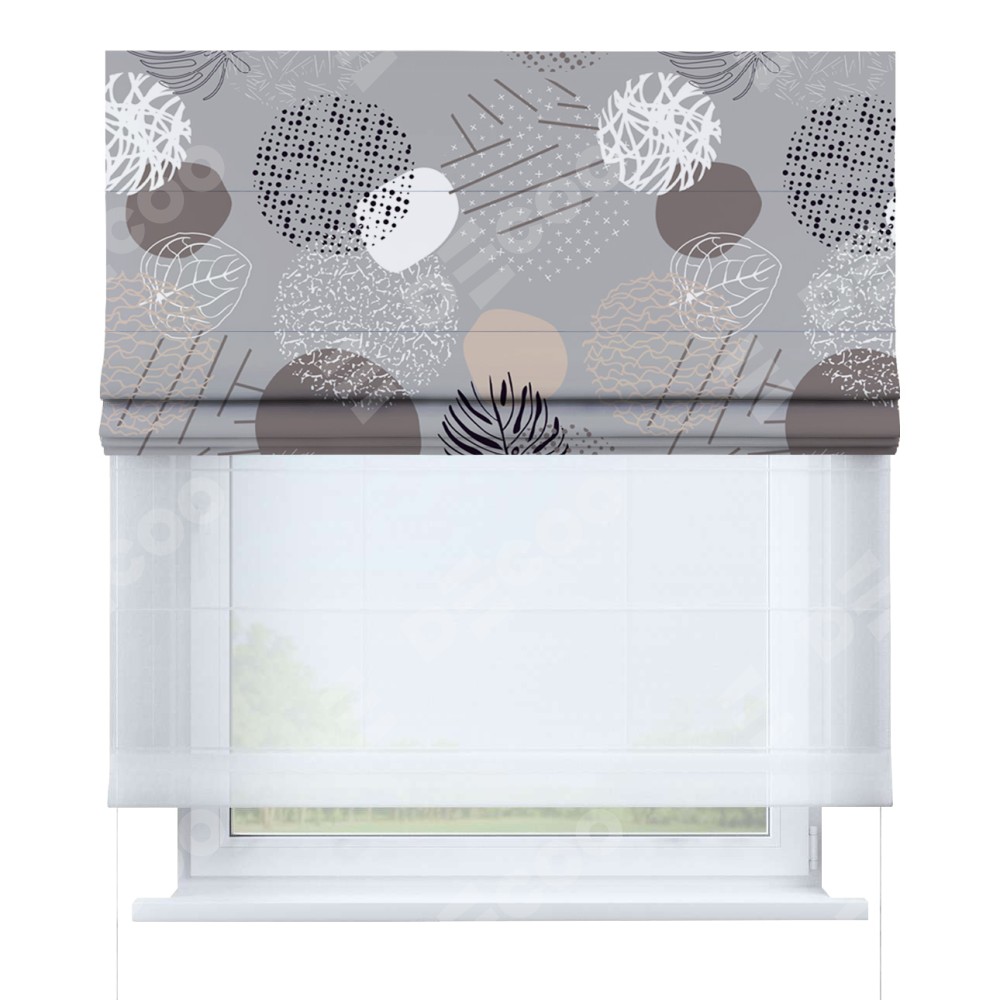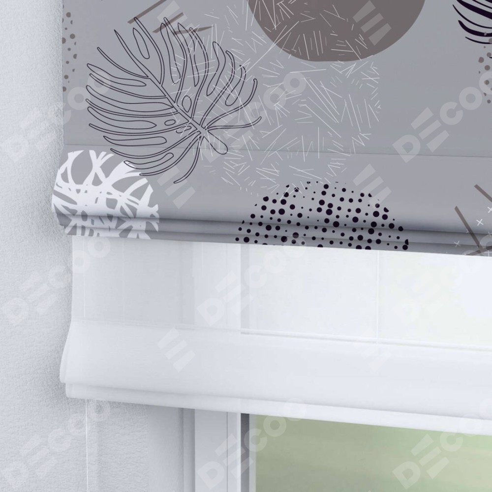 Римская штора день-ночь производителя «Cortin», используется для проёма, пошита из двух полотен, с лицевой блэкаут с нанесением сублимационной печати «Ботаника абстракция», вторая ткань тюль (по стандарту комплектуется тюль белого цвета артикул V-01). Имеет универсальный механизм и подходит для монтажа: на потолок, на стену и в нишу.