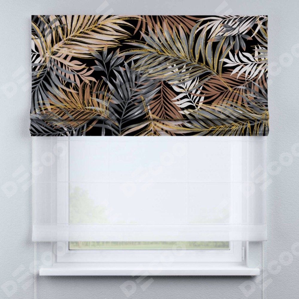 Римская штора день-ночь производителя «Cortin», используется для проёма, пошита из двух полотен, с лицевой блэкаут с нанесением сублимационной печати «Закат в тропиках», вторая ткань тюль (по стандарту комплектуется тюль белого цвета артикул V-01). Имеет универсальный механизм и подходит для монтажа: на потолок, на стену и в нишу.