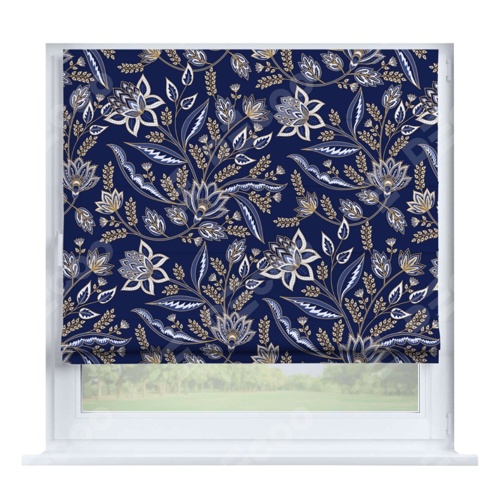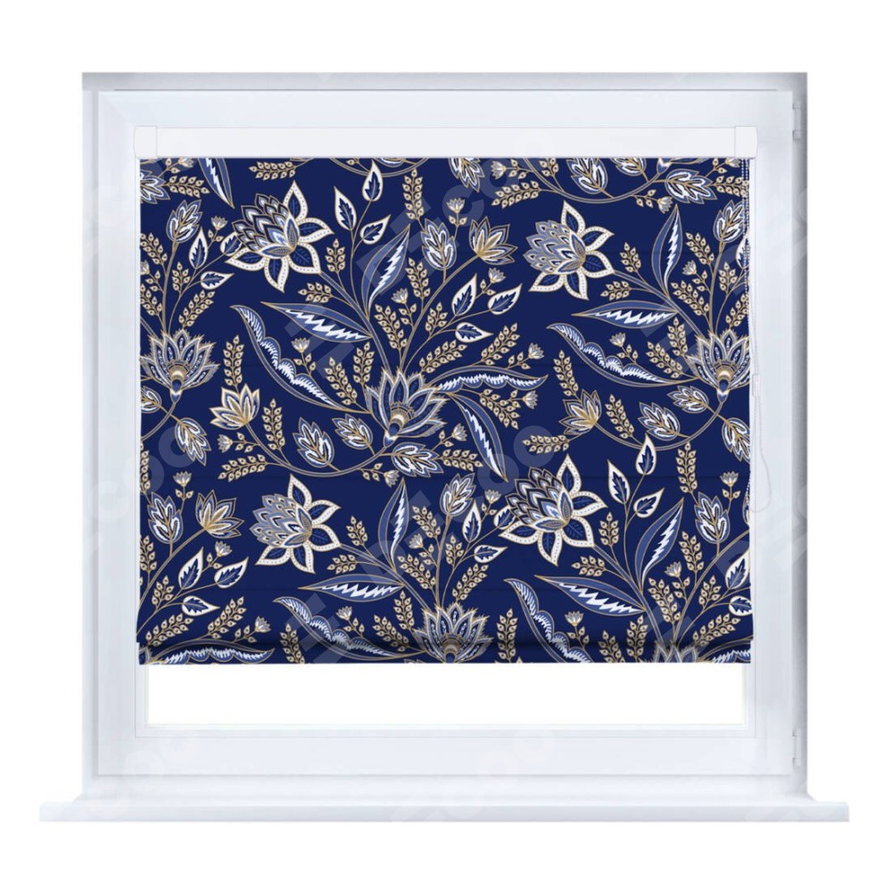 Римская штора производителя «Cortin», устанавливается на створку окна, пошита из ткани блэкаут с нанесением сублимационной печати «Индиго батик». Штора шьётся по индивидуальным размерам, для данного типа римской шторы возможная ширина от 35 до 150 см., высота до 250 см.