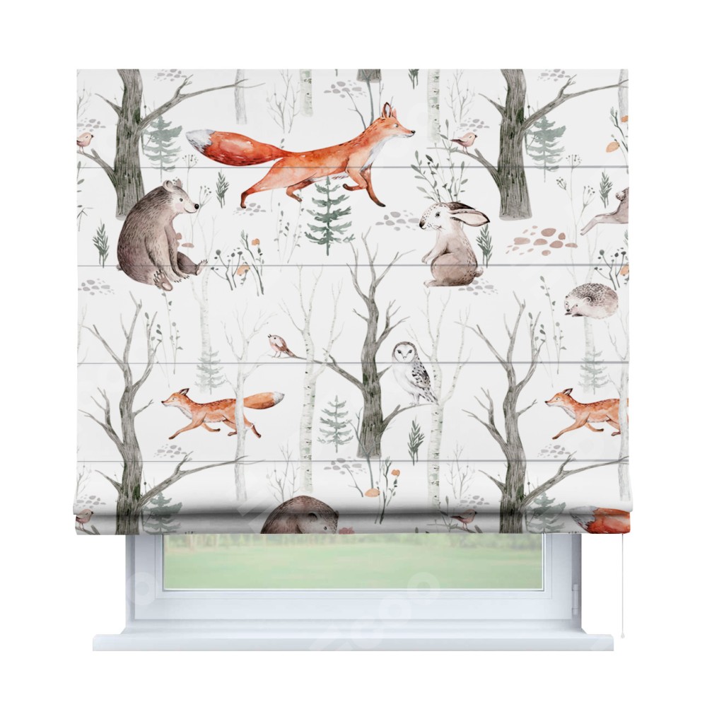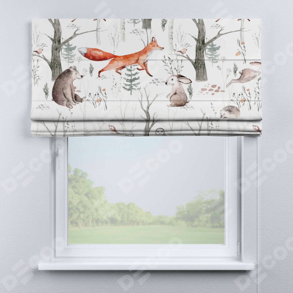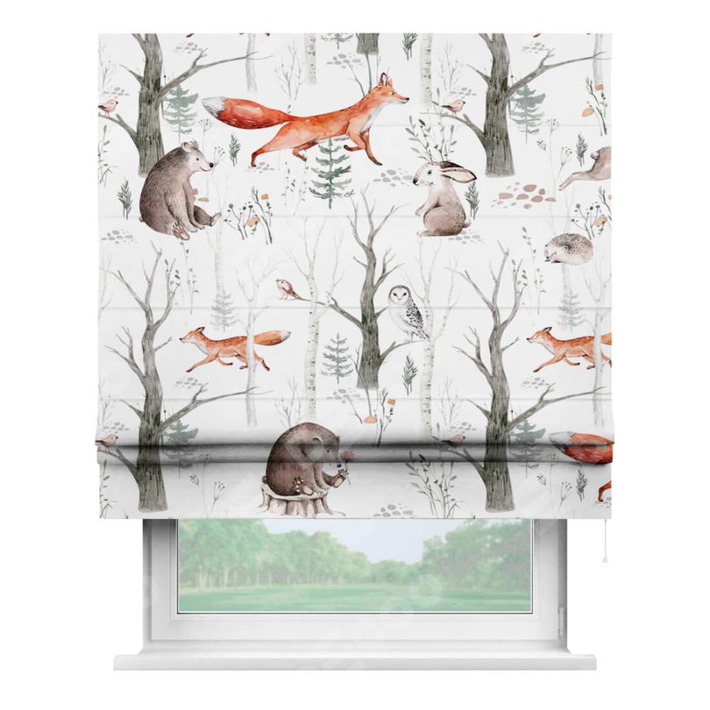 Римская штора производителя «Cortin», используется для проёма, пошита из ткани блэкаут с нанесением сублимационной печати «Лесной питомник». Имеет универсальный механизм и подходит для монтажа: на потолок, на стену и в нишу.