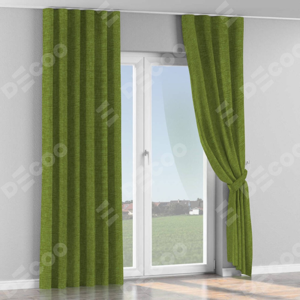 Комплект прямых штор, от производителя «Cortin», пошиты из ткани рогожка димаут салатовый, артикул ткани 80423. С изнаночной стороны в верхней части штор пристрачивается шторная лента с декоративными складками «Волна». Для создания элегантных складок прямые шторы шьются по стандарту с коэффициентом 1:2 (на 100 см. ширины проёма 200 см. ширины ткани).