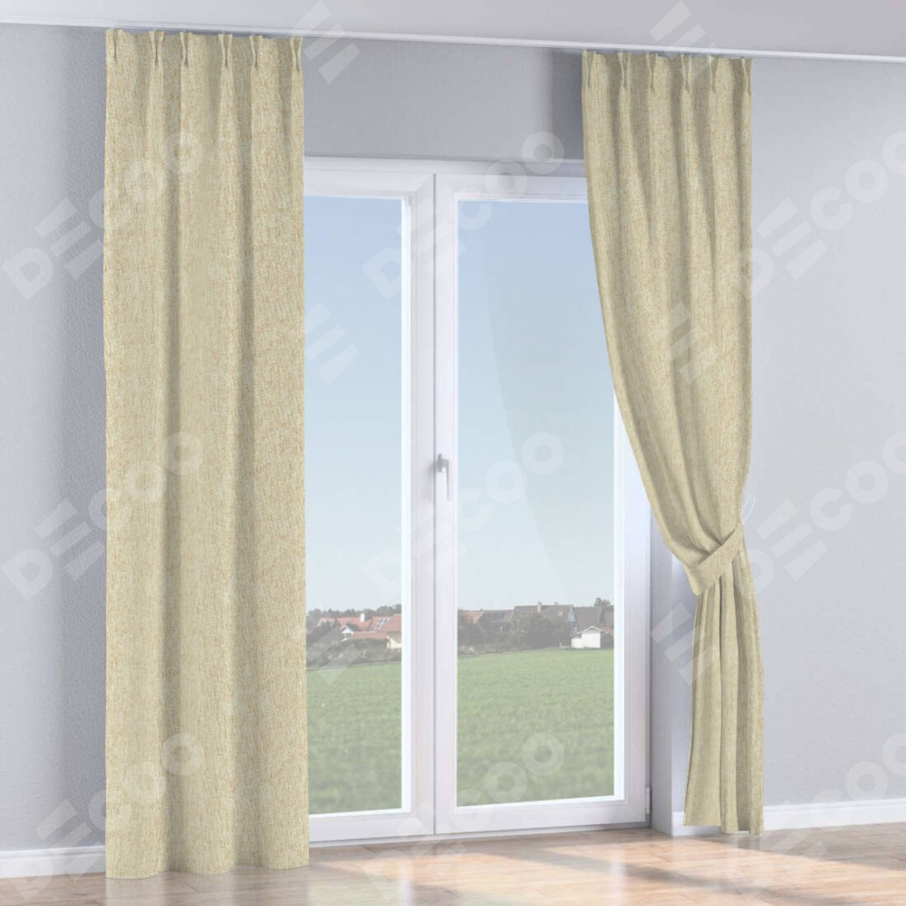 Комплект прямых штор, от производителя «Cortin», пошиты из ткани стиф димаут светло-бежевый, артикул ткани 18084. С изнаночной стороны в верхней части штор пристрачивается шторная лента с декоративными складками «Кустик». Для создания элегантных складок прямые шторы шьются по стандарту с коэффициентом 1:2 (на 100 см. ширины проёма 200 см. ширины ткани).