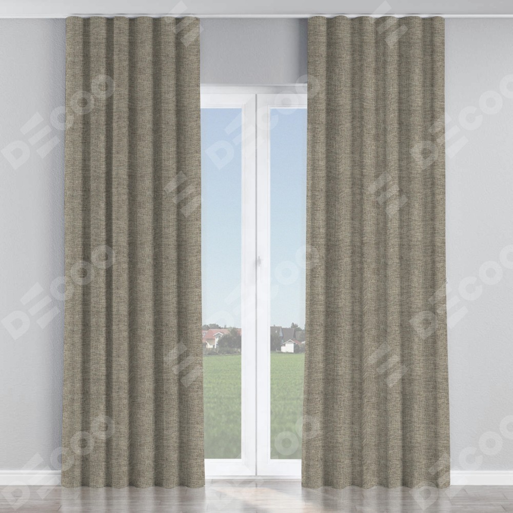 Комплект прямых штор, от производителя «Cortin», пошиты из ткани стиф димаут серо-коричневый, артикул ткани 44028. С изнаночной стороны в верхней части штор пристрачивается шторная лента с декоративными складками «Волна». Для создания элегантных складок прямые шторы шьются по стандарту с коэффициентом 1:2 (на 100 см. ширины проёма 200 см. ширины ткани).