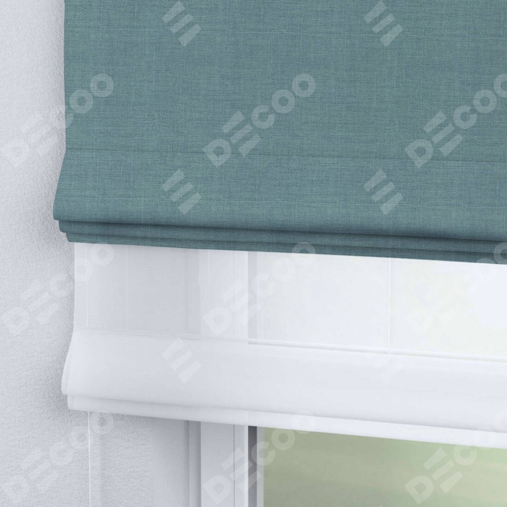 Римская штора день-ночь производителя «Cortin», используется для проёма, пошита из двух полотен, с лицевой стороны лён голубой артикул 74736, вторая ткань тюль (по стандарту комплектуется тюль белого цвета артикул V-01). Имеет универсальный механизм и подходит для монтажа: на потолок, на стену и в нишу.