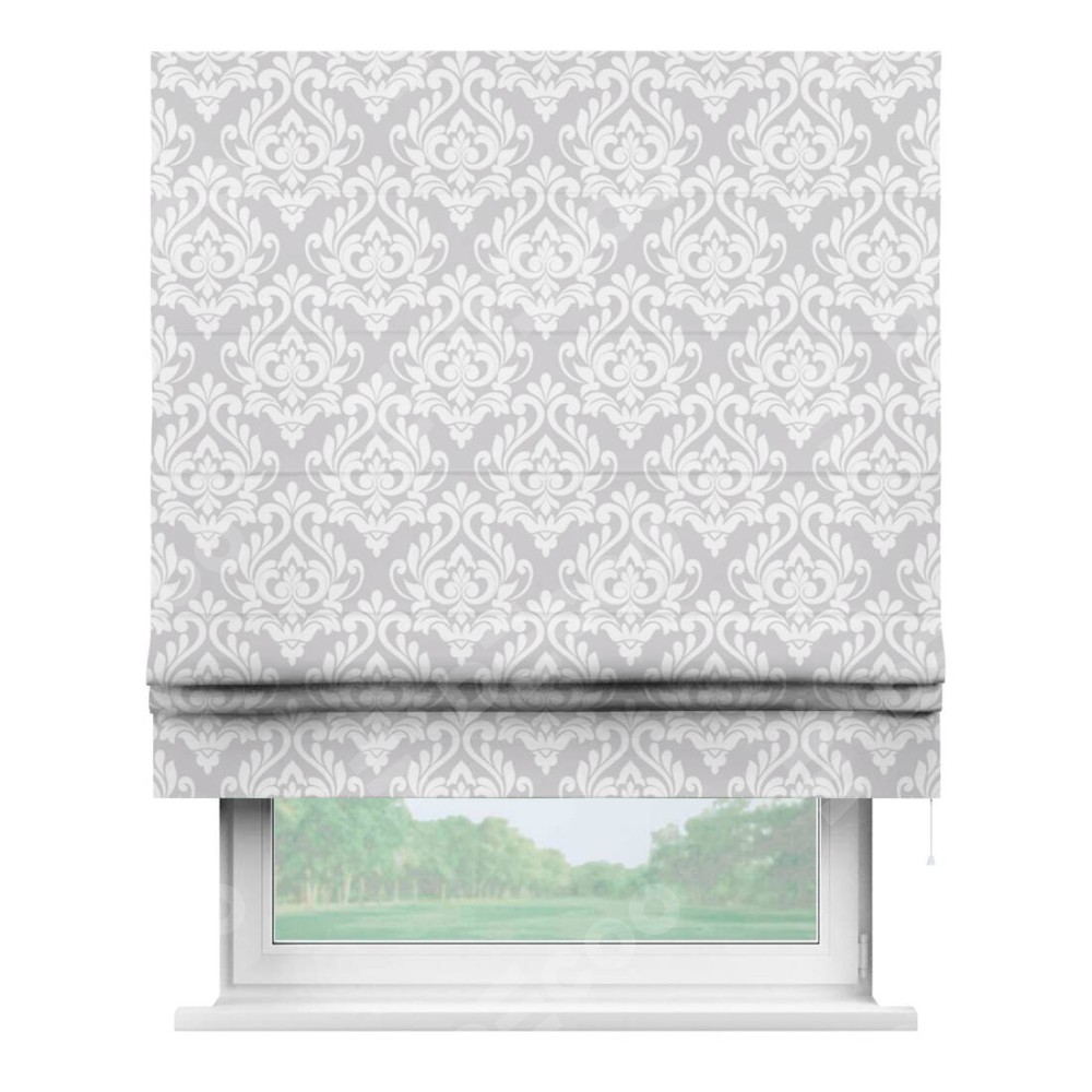 Римская штора производителя «Cortin», используется для проёма, пошита из ткани блэкаут с нанесением сублимационной печати «Дамаск светлый». Имеет универсальный механизм и подходит для монтажа: на потолок, на стену и в нишу.