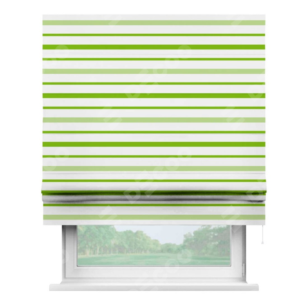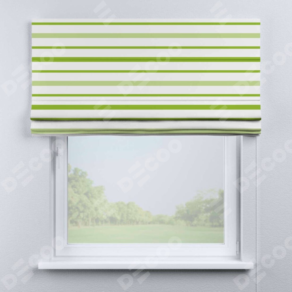 Римская штора производителя «Cortin», используется для проёма, пошита из ткани блэкаут с нанесением сублимационной печати «Зелёные горизонтальные полоски». Имеет универсальный механизм и подходит для монтажа: на потолок, на стену и в нишу.