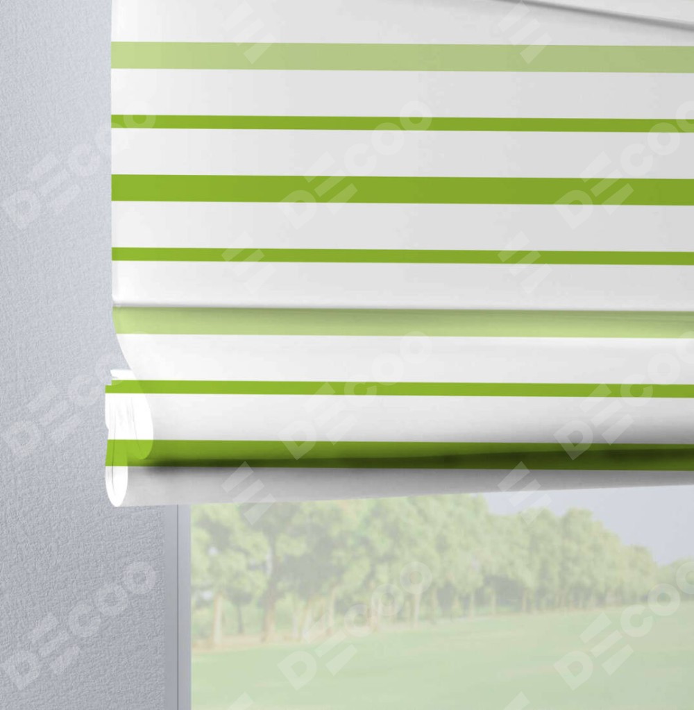 Римская штора производителя «Cortin», используется для проёма, пошита из ткани блэкаут с нанесением сублимационной печати «Зелёные горизонтальные полоски». Данная модель пошита на петлях, комплектуется на выбор круглым карнизом и подходит для монтажа на стену. Римская штора на петлях имеет простую систему регулировки высоты, отличительным преимуществом данной модели является простой способ монтажа. Достаточно повесить ее на трубу и штора готова!