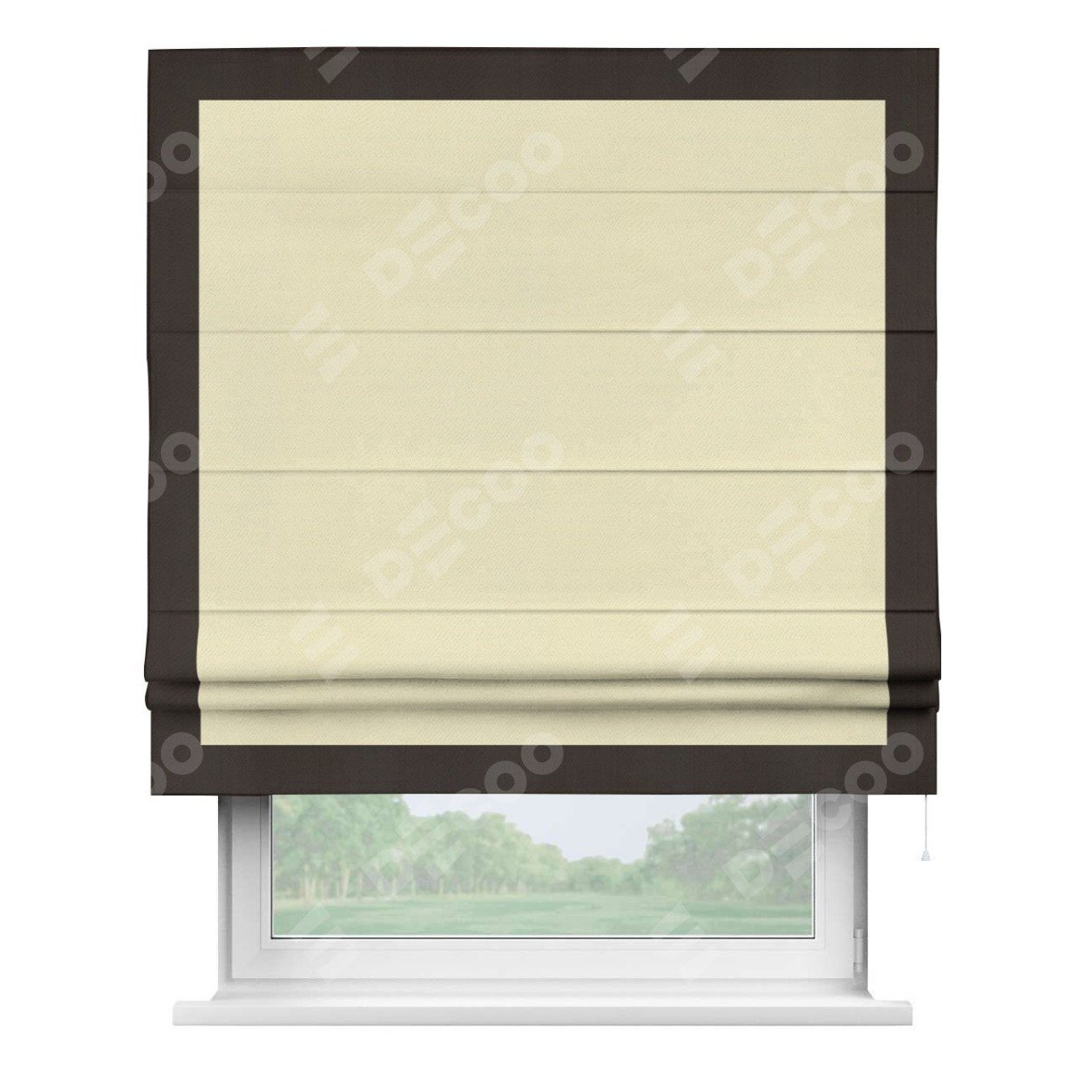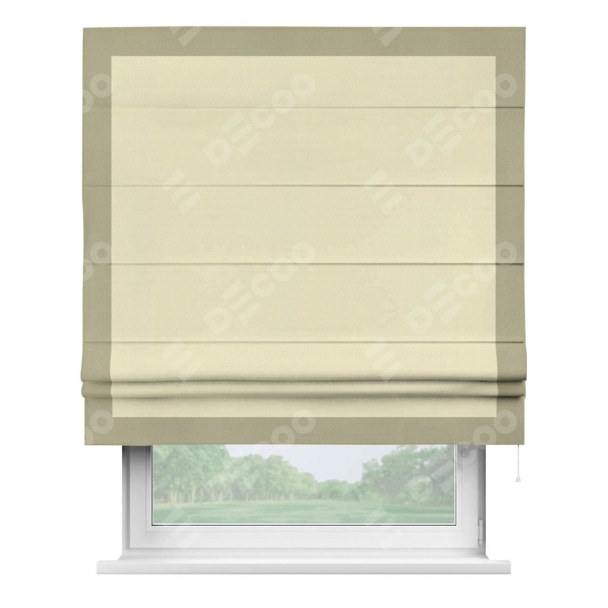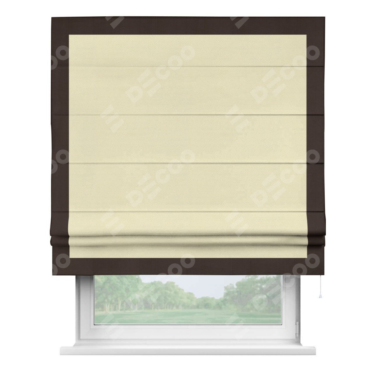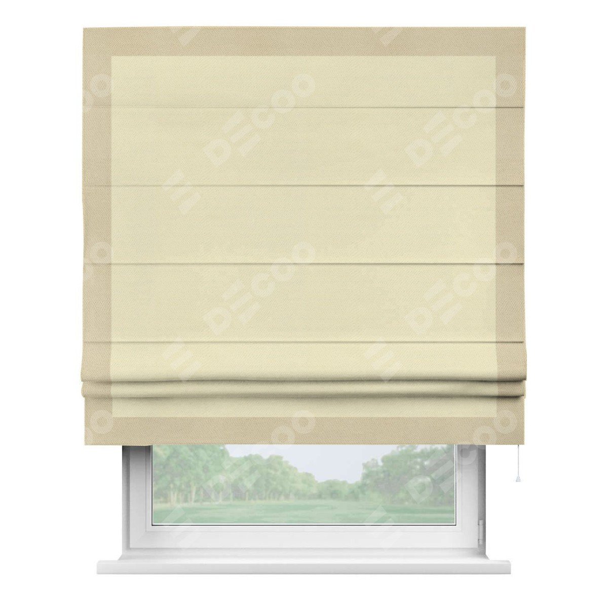 Римская штора производителя «Cortin», используется для проёма, пошита из ткани блэкаут однотонный бежевый, артикул ткани 88283. Отделка шторы кантом «Чесс», ткань для канта используется из блэкаута однотонного разной расцветки на выбор. Имеет универсальный механизм и подходит для монтажа: на потолок, на стену и в нишу.