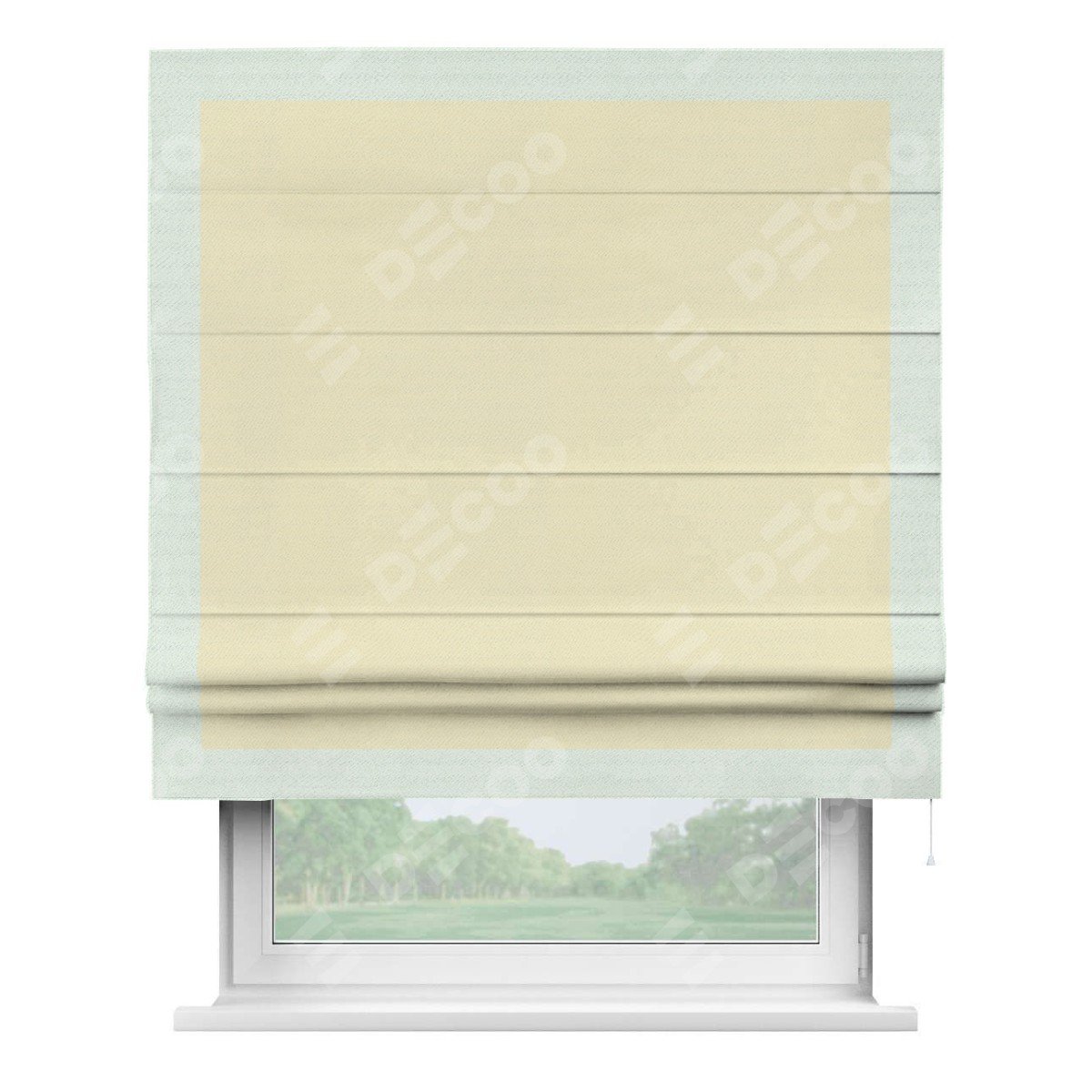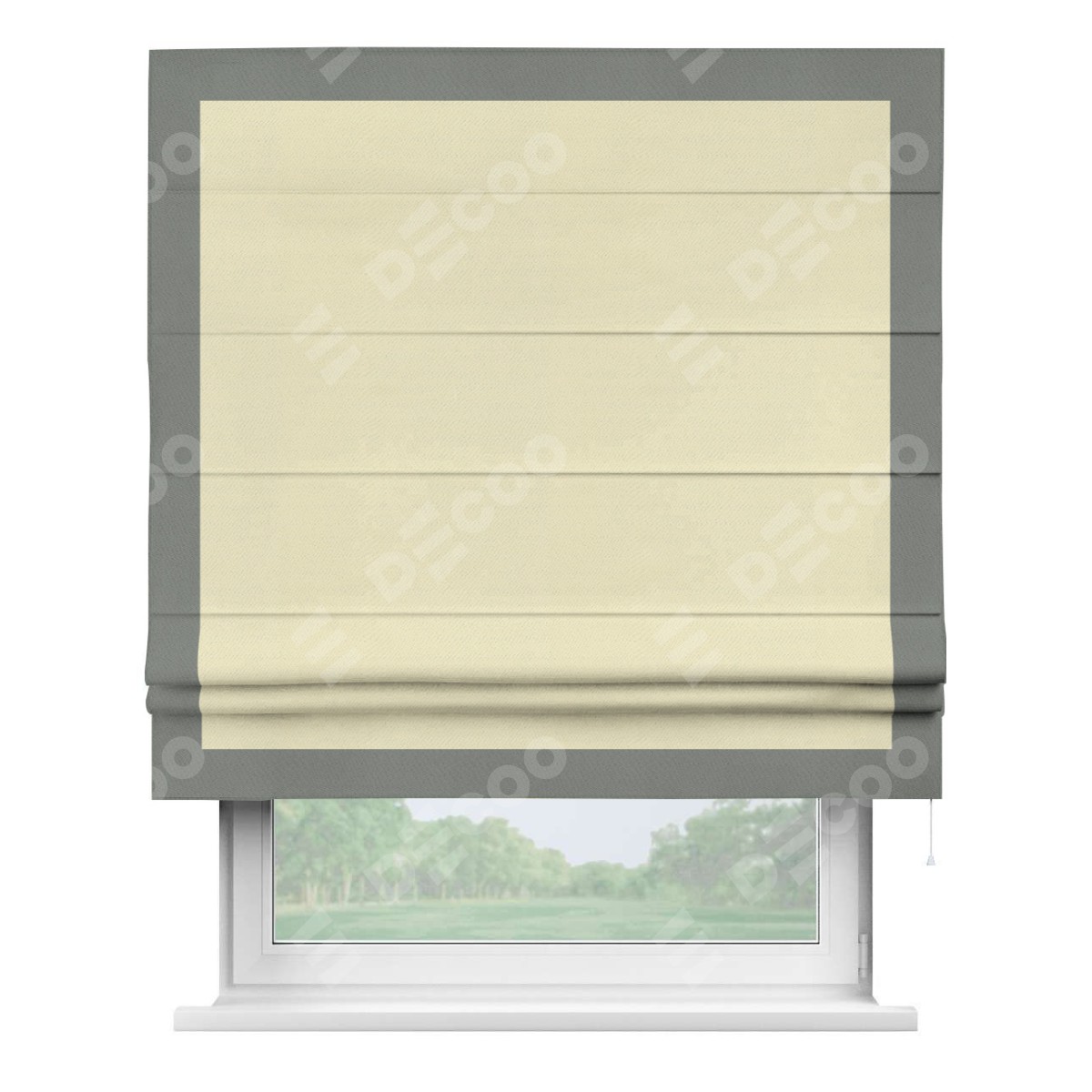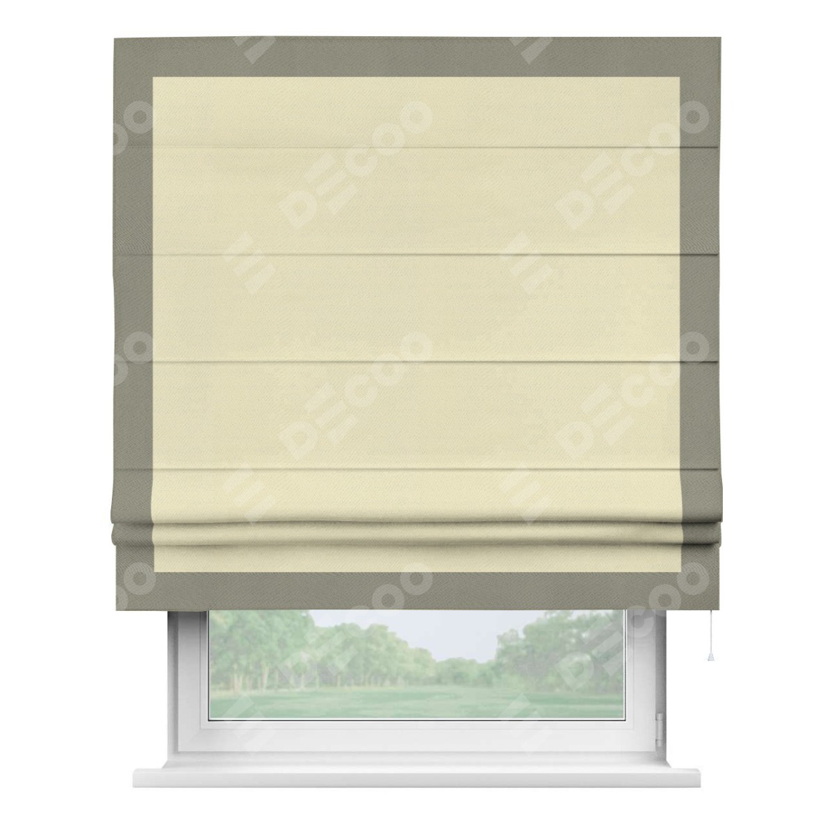 Римская штора производителя «Cortin», используется для проёма, пошита из ткани блэкаут однотонный бежевый, артикул ткани 88283. Отделка шторы кантом «Чесс», ткань для канта используется из блэкаута однотонного разной расцветки на выбор. Имеет универсальный механизм и подходит для монтажа: на потолок, на стену и в нишу.