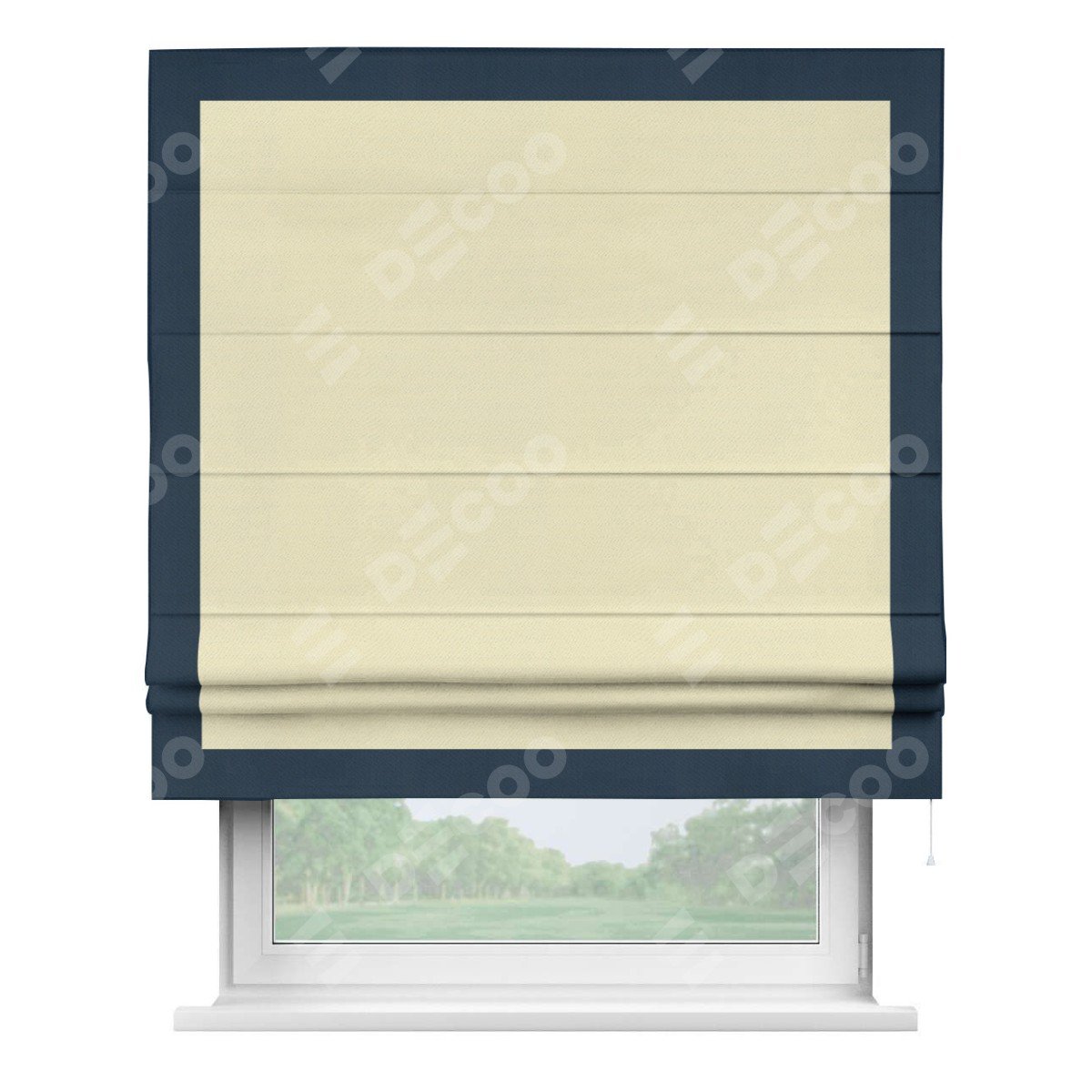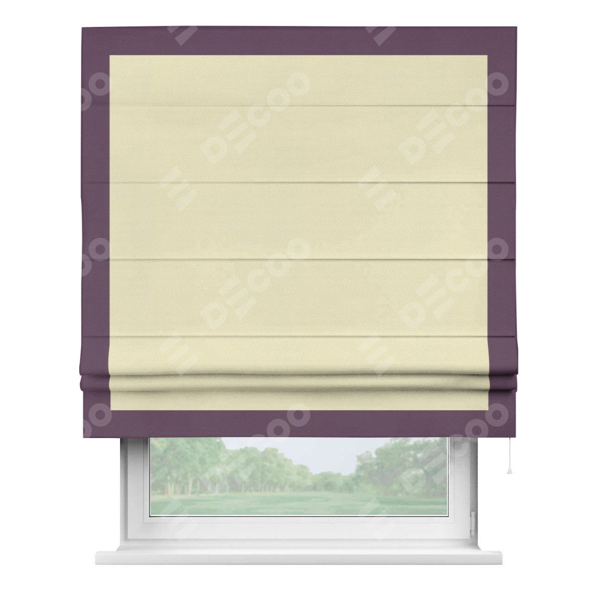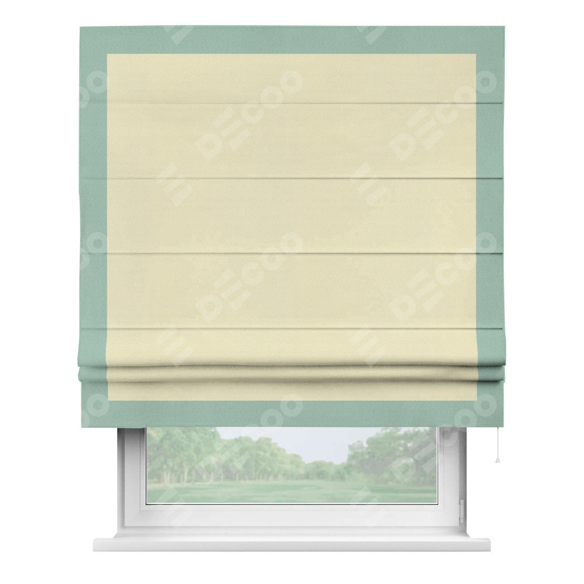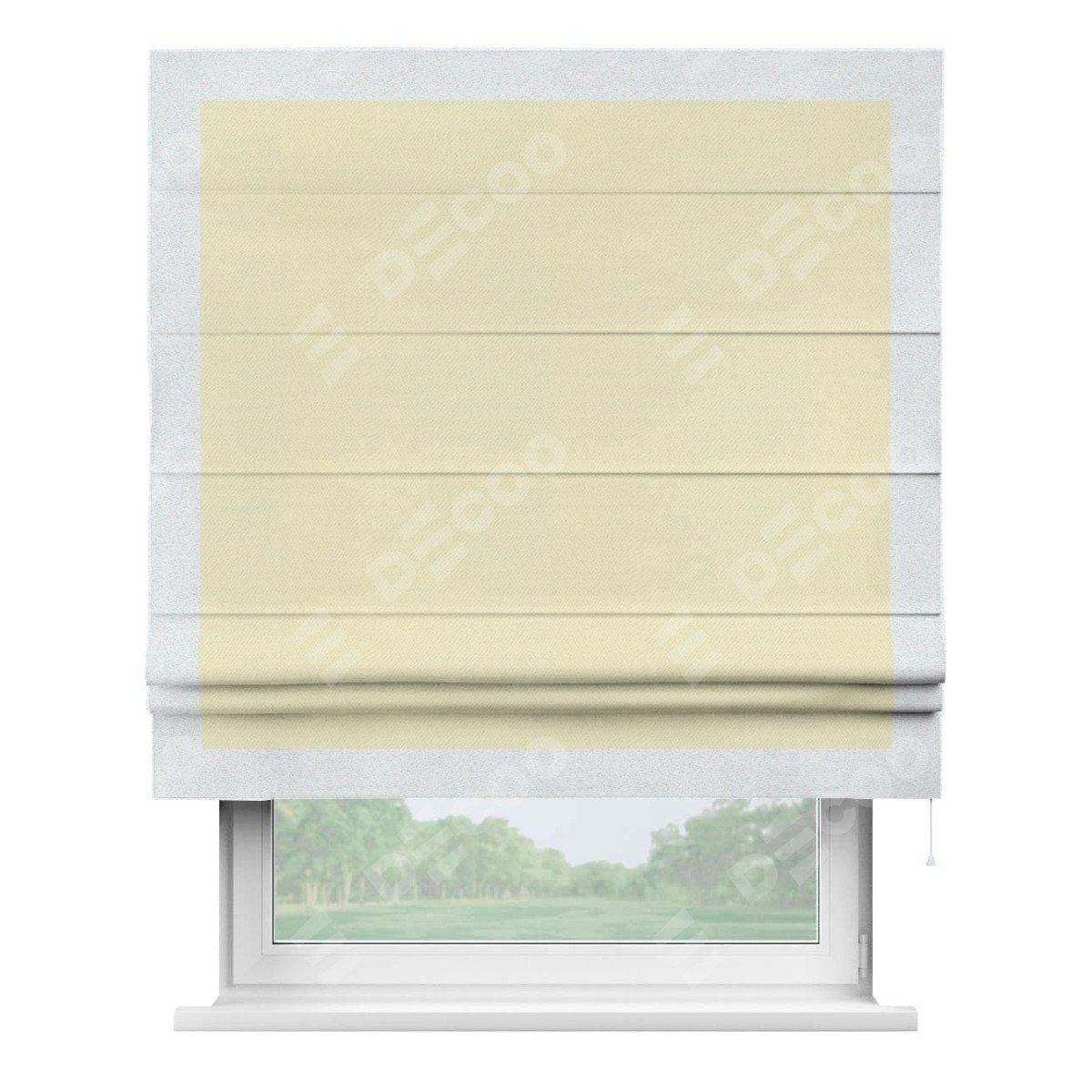 Римская штора производителя «Cortin», используется для проёма, пошита из ткани блэкаут однотонный бежевый, артикул ткани 88283. Отделка шторы кантом «Чесс», ткань для канта используется из блэкаута однотонного разной расцветки на выбор. Имеет универсальный механизм и подходит для монтажа: на потолок, на стену и в нишу.