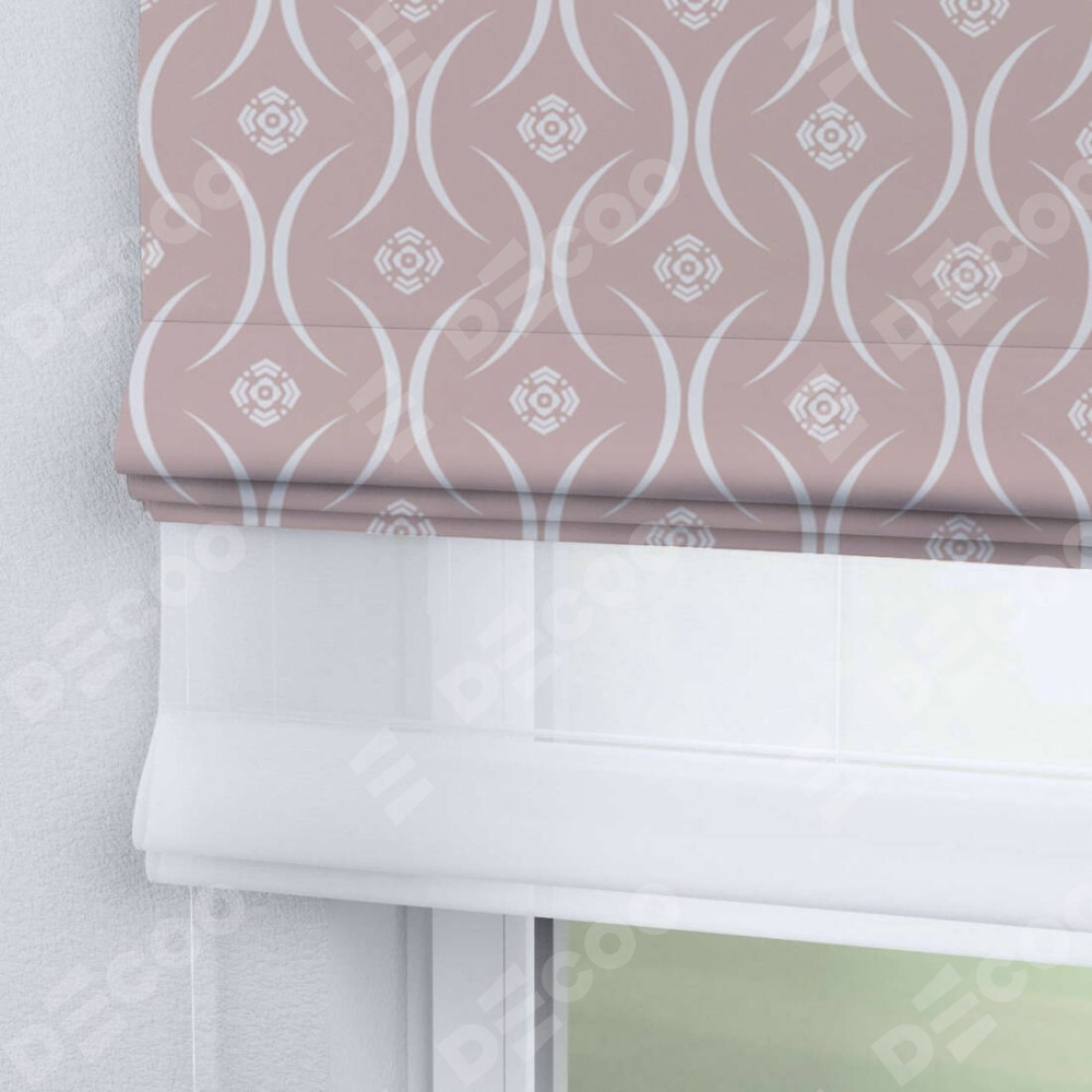 Римская штора день-ночь производителя «Cortin», используется для проёма, пошита из двух полотен, с лицевой блэкаут с нанесением сублимационной печати «Воздушный узор бежевый», вторая ткань тюль (по стандарту комплектуется тюль белого цвета артикул V-01). Имеет универсальный механизм и подходит для монтажа: на потолок, на стену и в нишу.