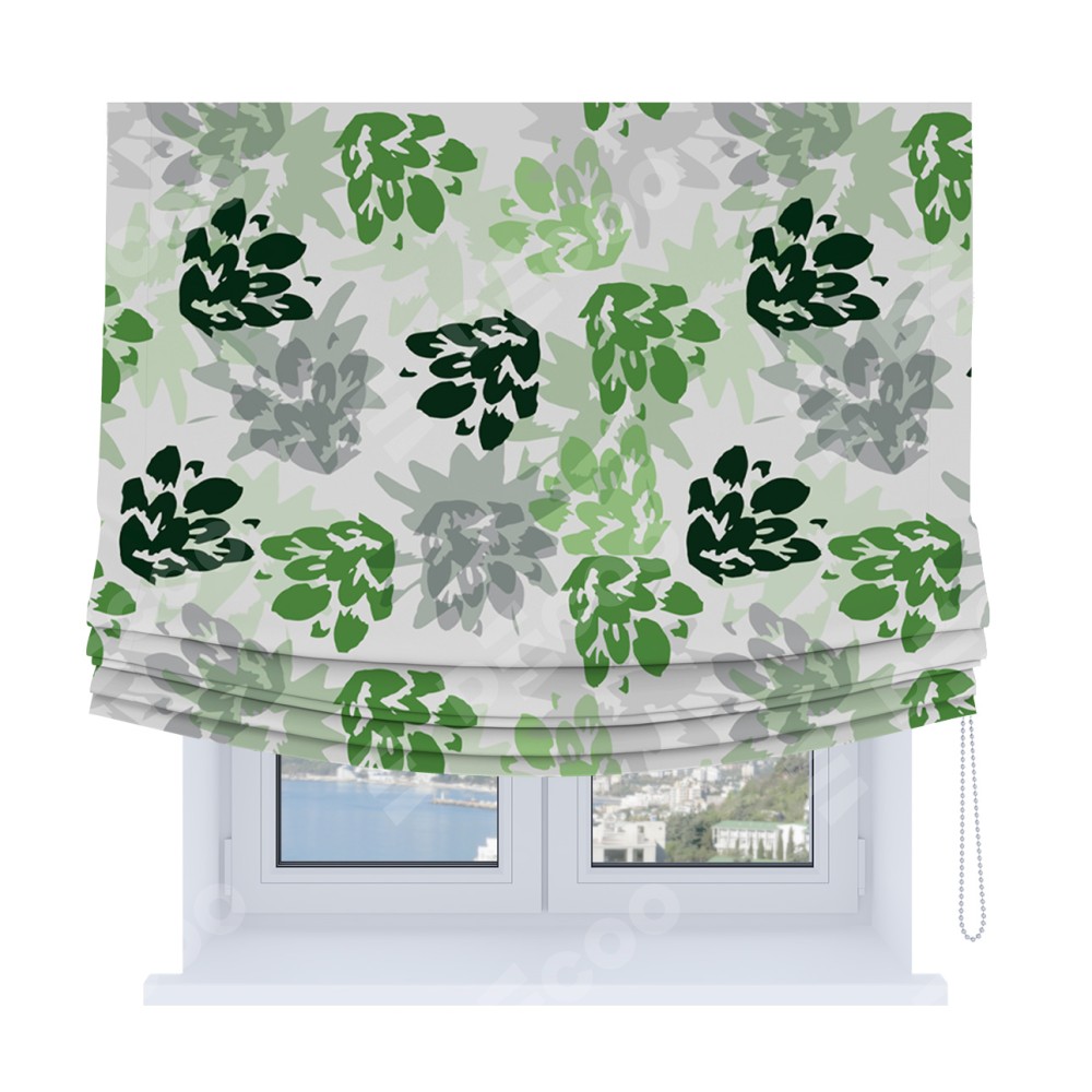 Римская штора Soft производителя «Cortin», используется для проёма, пошита из ткани блэкаут с нанесением сублимационной печати «Зелёный луг». Имеет универсальный механизм и подходит для монтажа: на потолок, на стену и в нишу. В отличие от стандартных римских штор, римская штора Soft не имеет горизонтальных вставок и нижнего отвеса. Это позволяет ткани произвольно драпироваться в свободные мягкие складки.