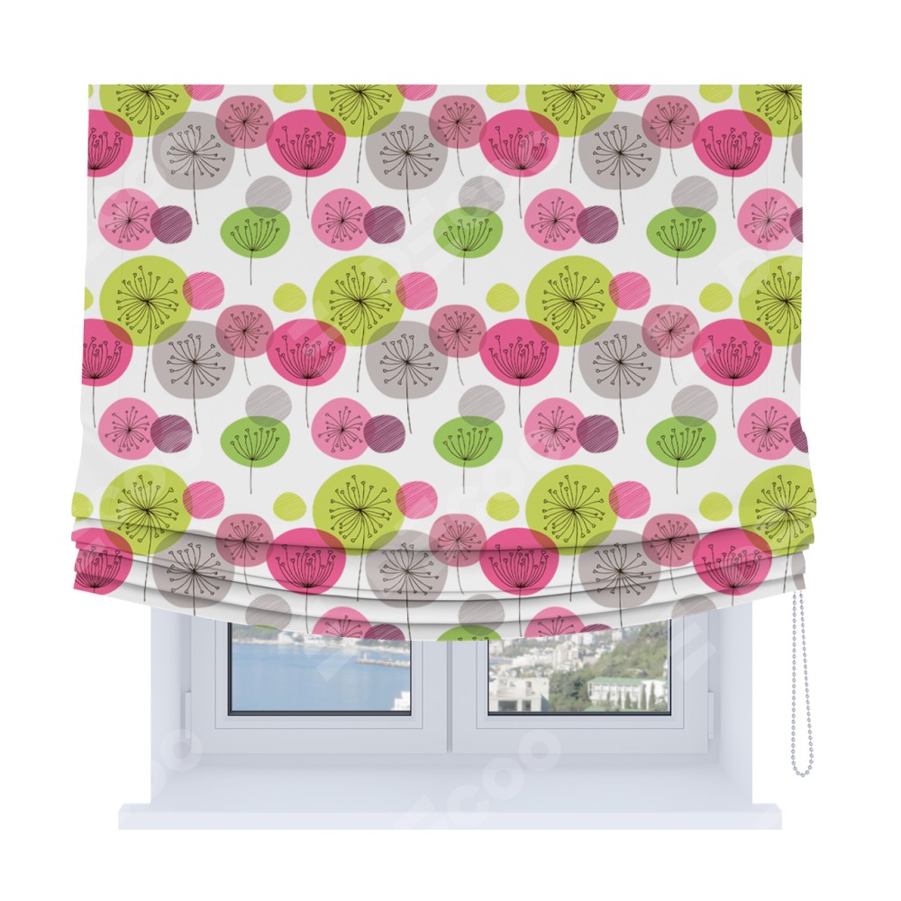 Римская штора Soft производителя «Cortin», используется для проёма, пошита из ткани блэкаут с нанесением сублимационной печати «Цветные одуванчики». Имеет универсальный механизм и подходит для монтажа: на потолок, на стену и в нишу. В отличие от стандартных римских штор, римская штора Soft не имеет горизонтальных вставок и нижнего отвеса. Это позволяет ткани произвольно драпироваться в свободные мягкие складки.