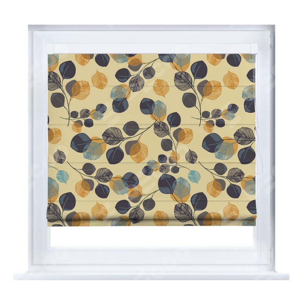 Римская штора производителя «Cortin», устанавливается на створку окна, пошита из ткани блэкаут с нанесением сублимационной печати «Листья в янтаре». Штора шьётся по индивидуальным размерам, для данного типа римской шторы возможная ширина от 35 до 150 см., высота до 250 см.