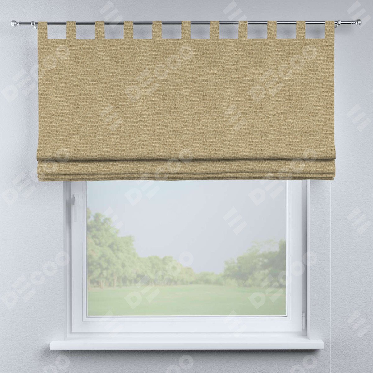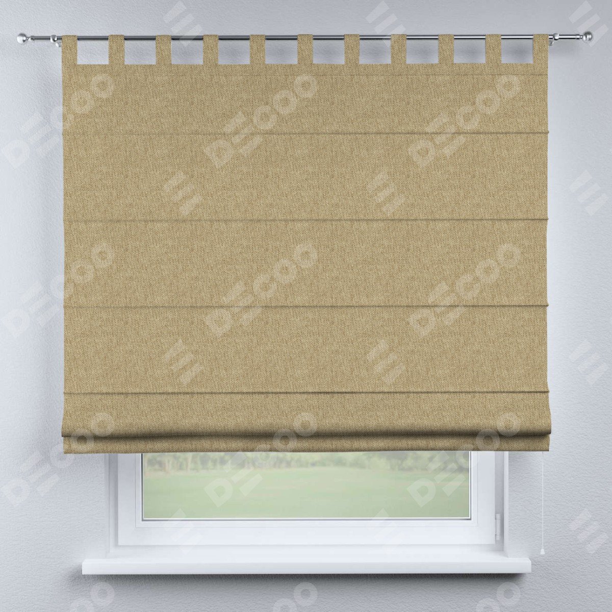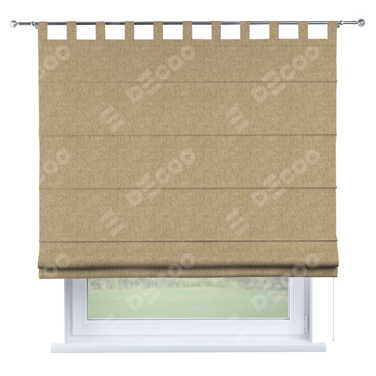 Римская штора производителя «Cortin», используется для проёма, пошита из ткани стиф димаут бежевый, артикул ткани 18083. Данная модель пошита на петлях, комплектуется на выбор круглым карнизом и подходит для монтажа на стену. Римская штора на петлях имеет простую систему регулировки высоты, отличительным преимуществом данной модели является простой способ монтажа. Достаточно повесить ее на трубу и штора готова!