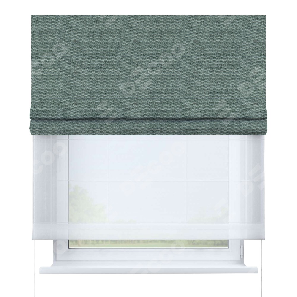 Римская штора день-ночь производителя «Cortin», используется для проёма, пошита из двух полотен, с лицевой стороны стиф димаут серо-голубой артикул 44029, вторая ткань тюль (по стандарту комплектуется тюль белого цвета артикул V-01). Имеет универсальный механизм и подходит для монтажа: на потолок, на стену и в нишу.