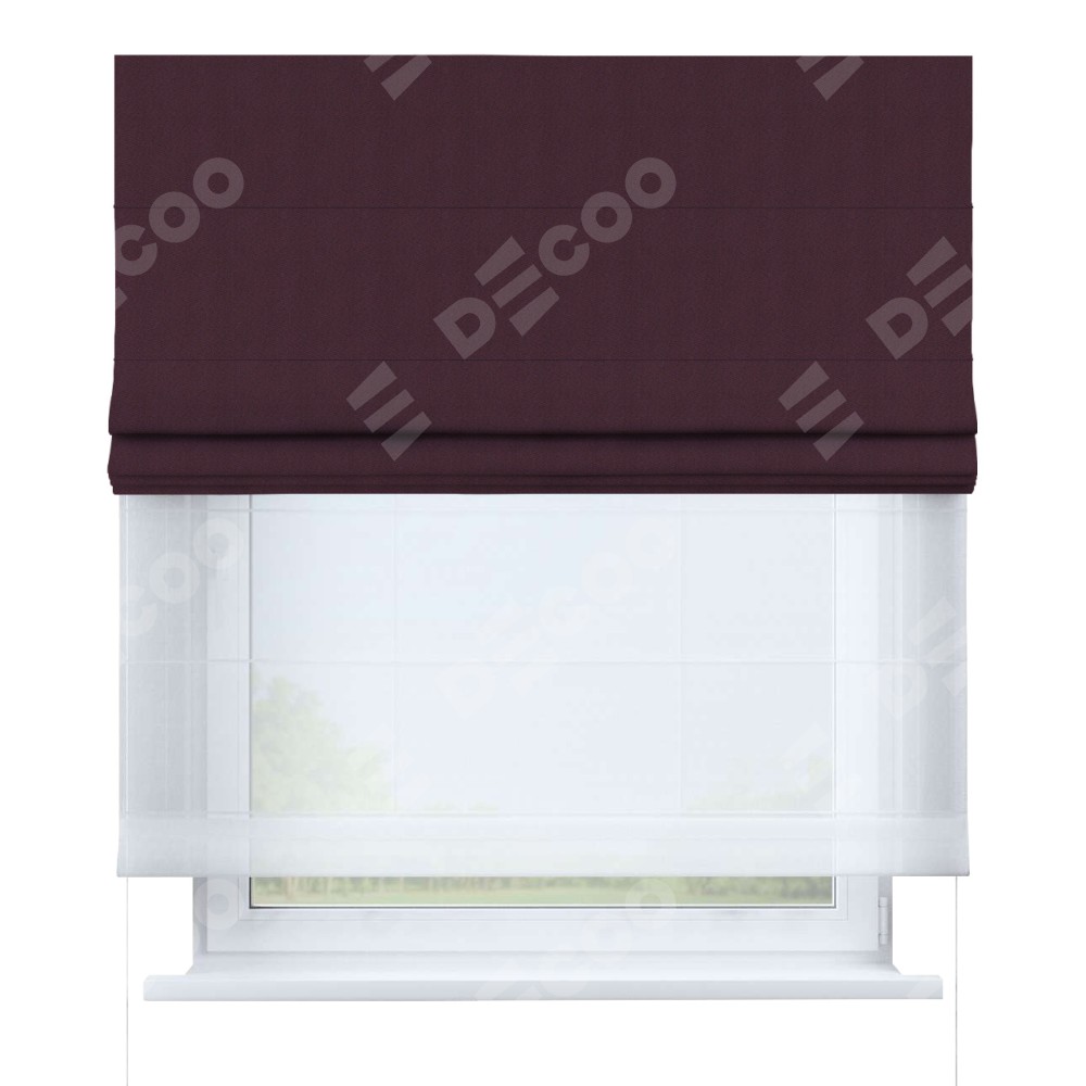 Римская штора день-ночь производителя «Cortin», используется для проёма, пошита из двух полотен, с лицевой стороны блэкаут однотонный сиреневый артикул 29333−2, вторая ткань тюль (по стандарту комплектуется тюль белого цвета артикул V-01). Имеет универсальный механизм и подходит для монтажа: на потолок, на стену и в нишу.