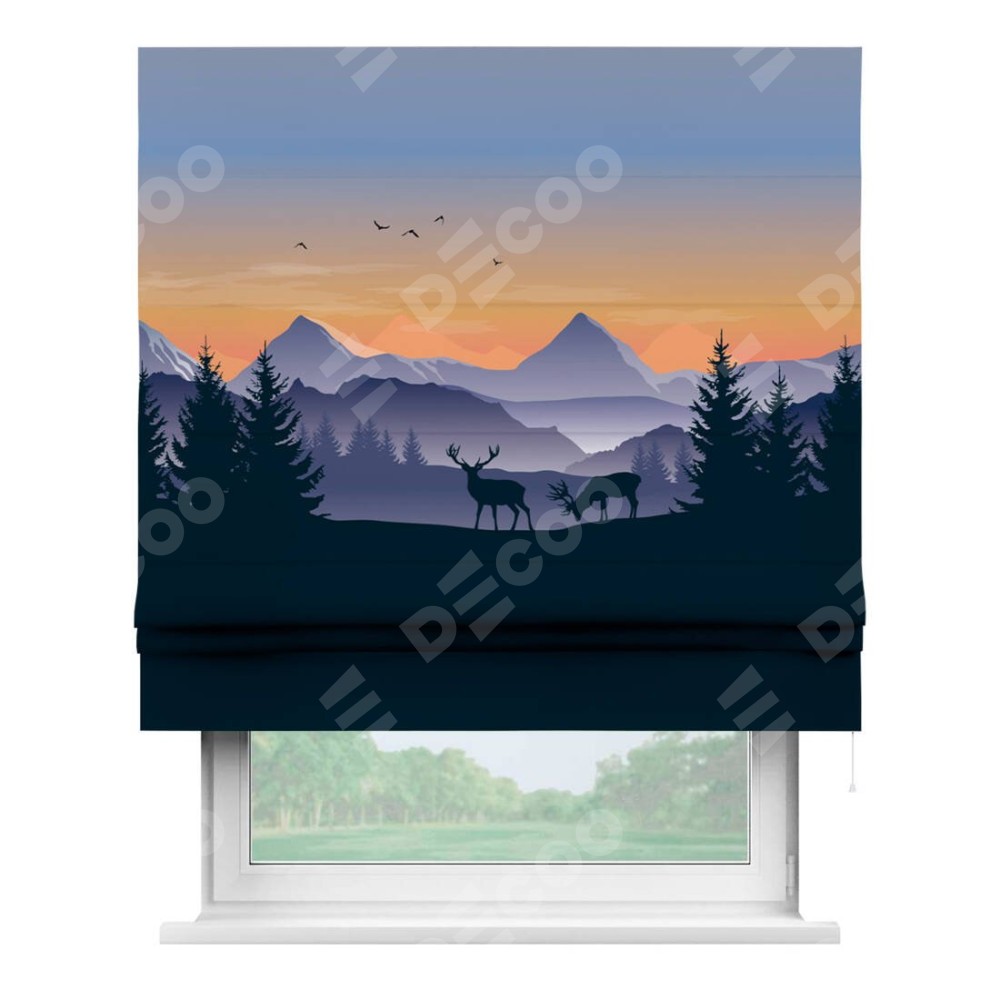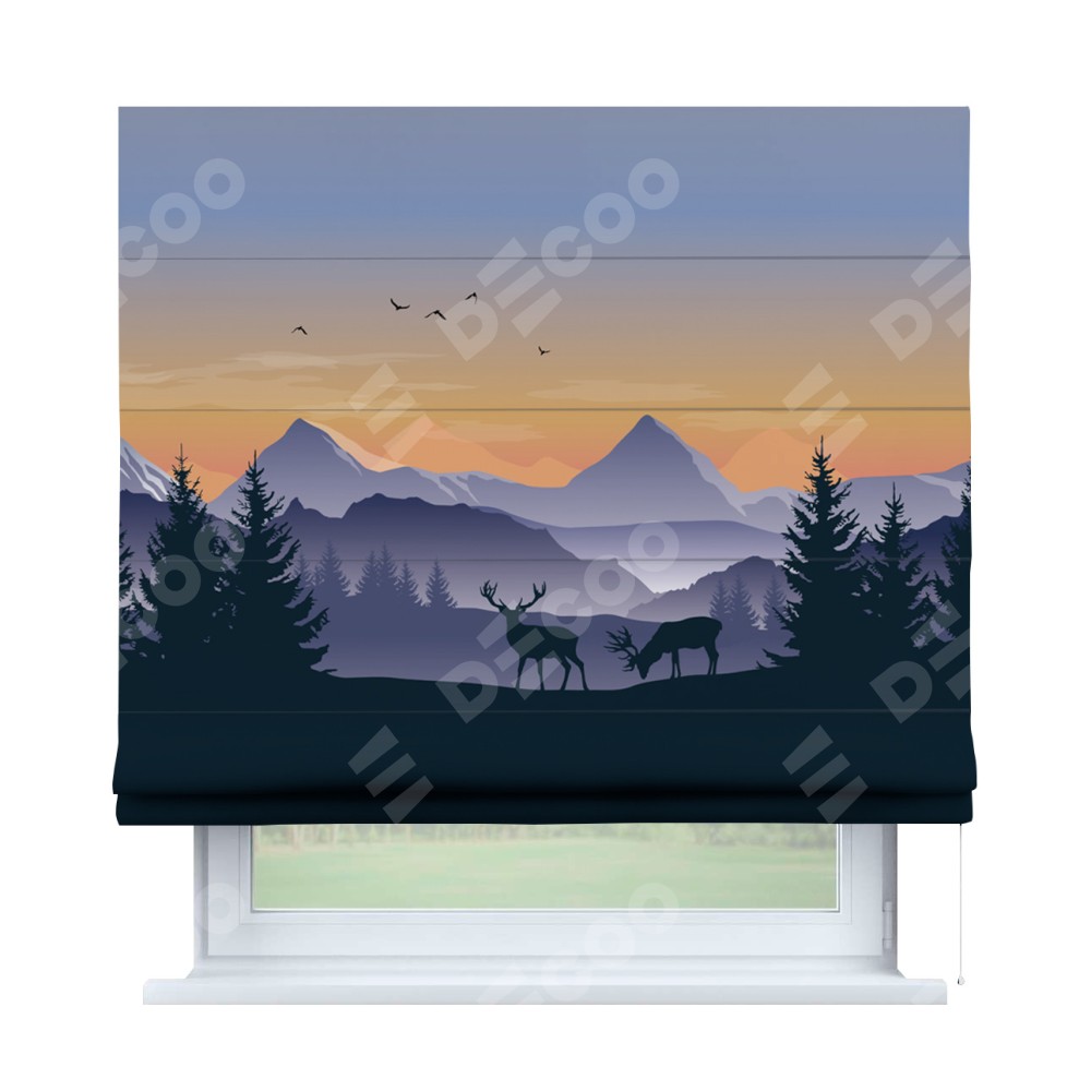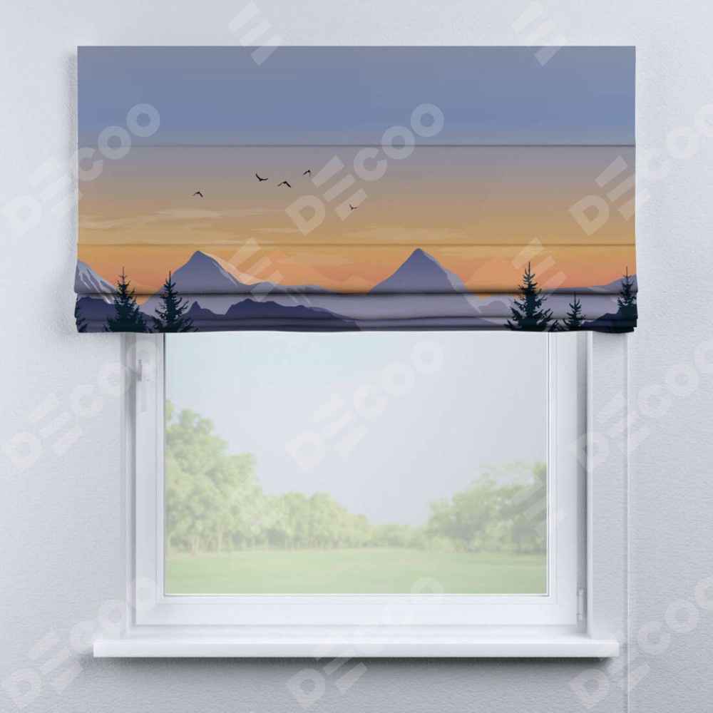 Римская штора производителя «Cortin», используется для проёма, пошита из ткани блэкаут с нанесением сублимационной печати «Закат в горах». Имеет универсальный механизм и подходит для монтажа: на потолок, на стену и в нишу.