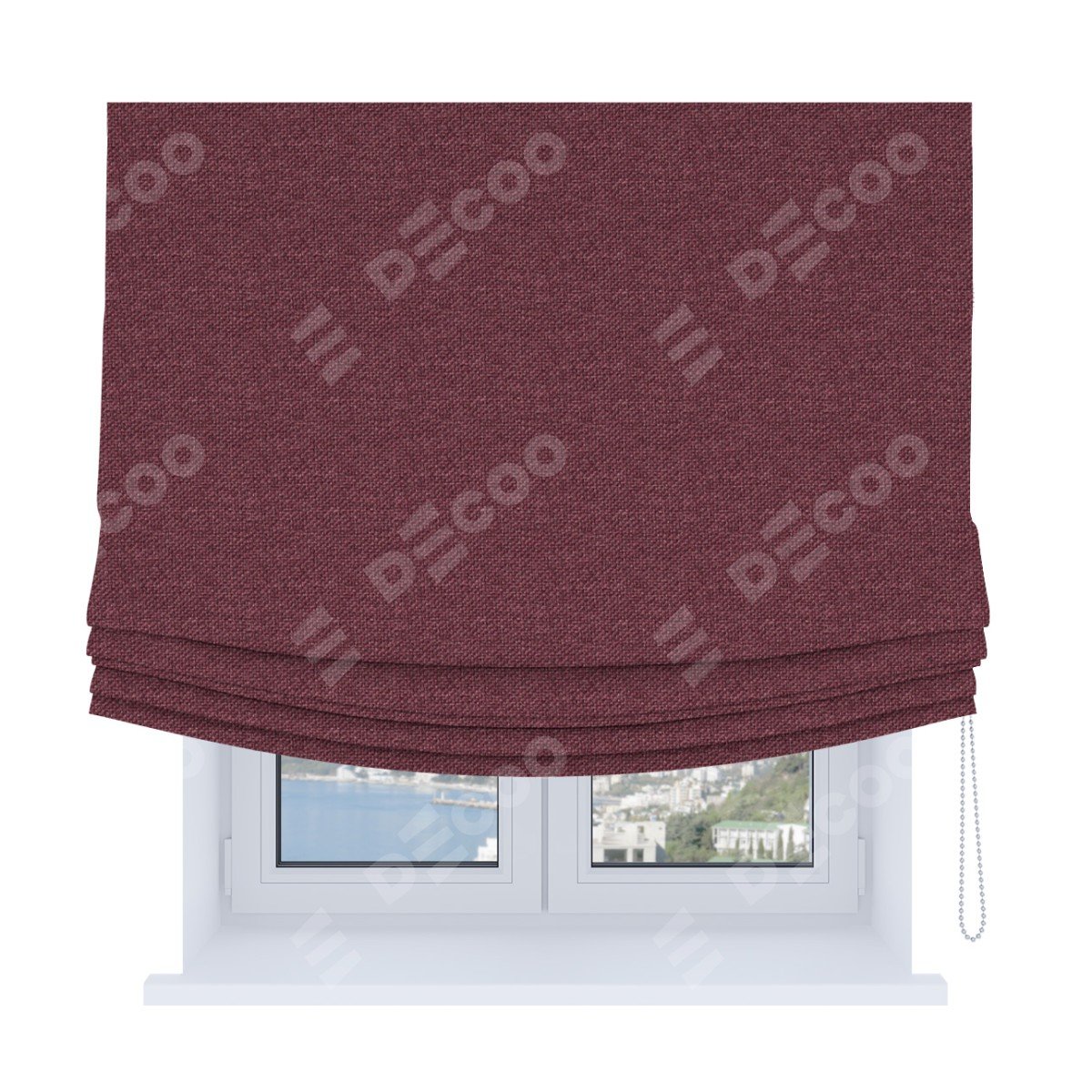 Римская штора Soft производителя «Cortin», используется для проёма, пошита из ткани лён димаут марсала, артикул ткани 1602. Имеет универсальный механизм и подходит для монтажа: на потолок, на стену и в нишу. В отличие от стандартных римских штор, римская штора Soft не имеет горизонтальных вставок и нижнего отвеса. Это позволяет ткани произвольно драпироваться в свободные мягкие складки.
