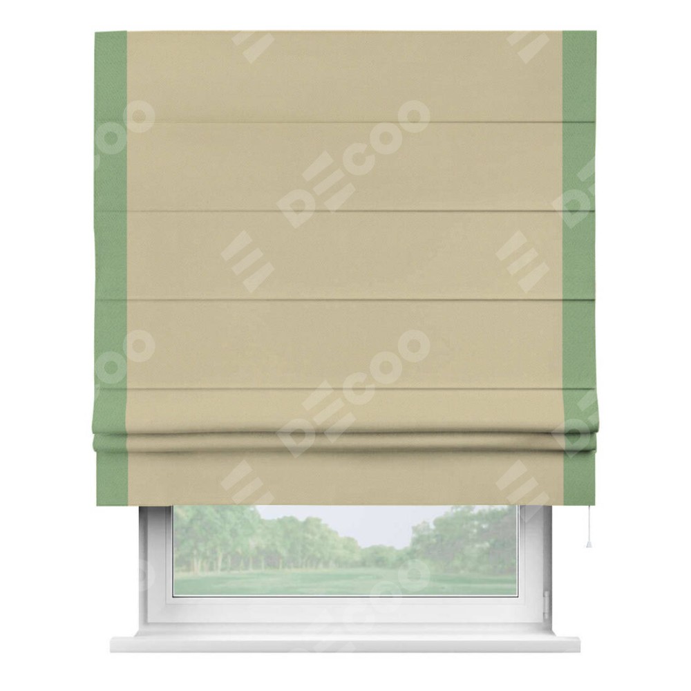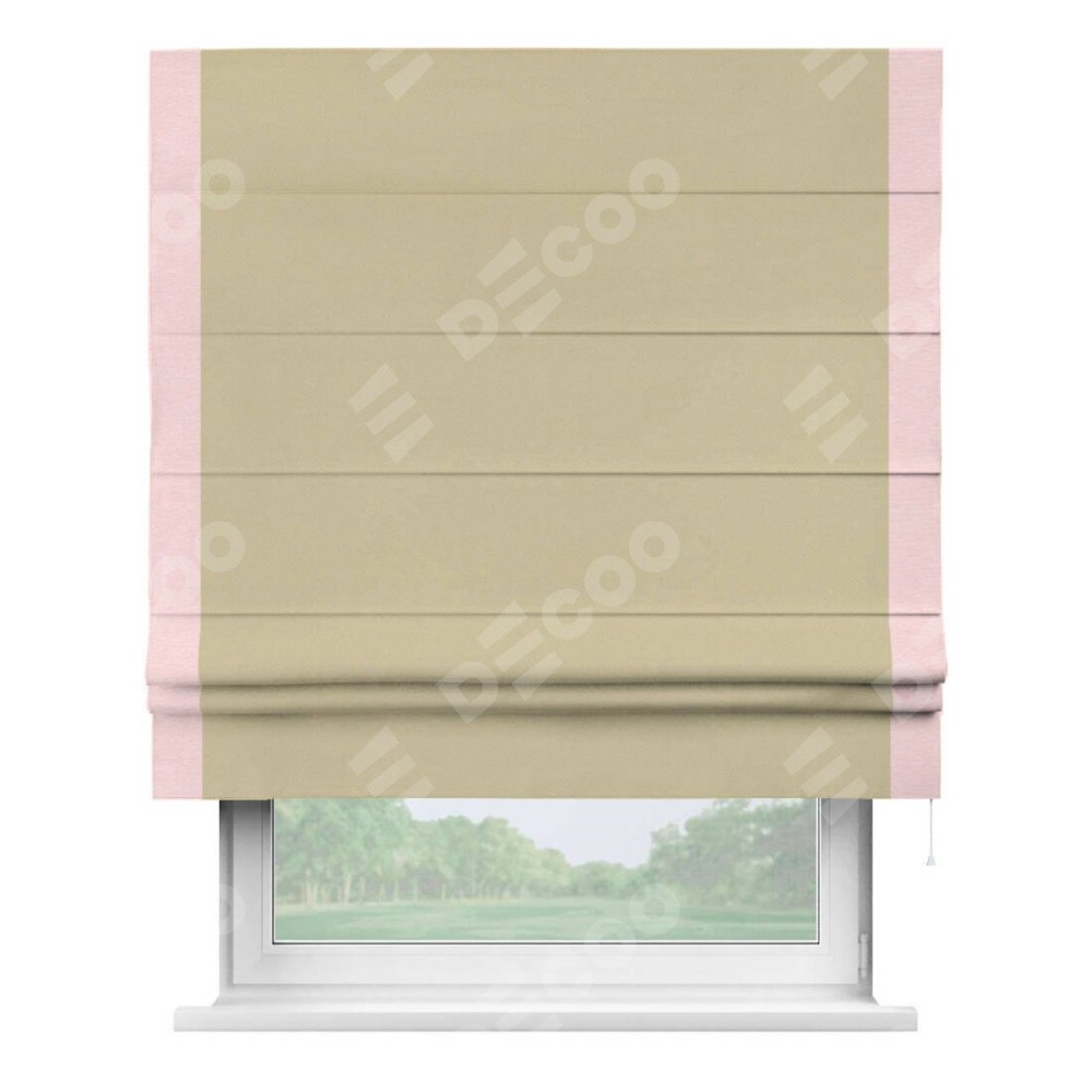 Римская штора производителя «Cortin», используется для проёма, пошита из ткани блэкаут однотонный кофейный, артикул ткани 13130. Отделка шторы кантом «Стрим Дуо», ткань для канта используется из блэкаута однотонного разной расцветки на выбор. Имеет универсальный механизм и подходит для монтажа: на потолок, на стену и в нишу.