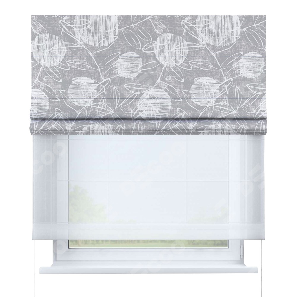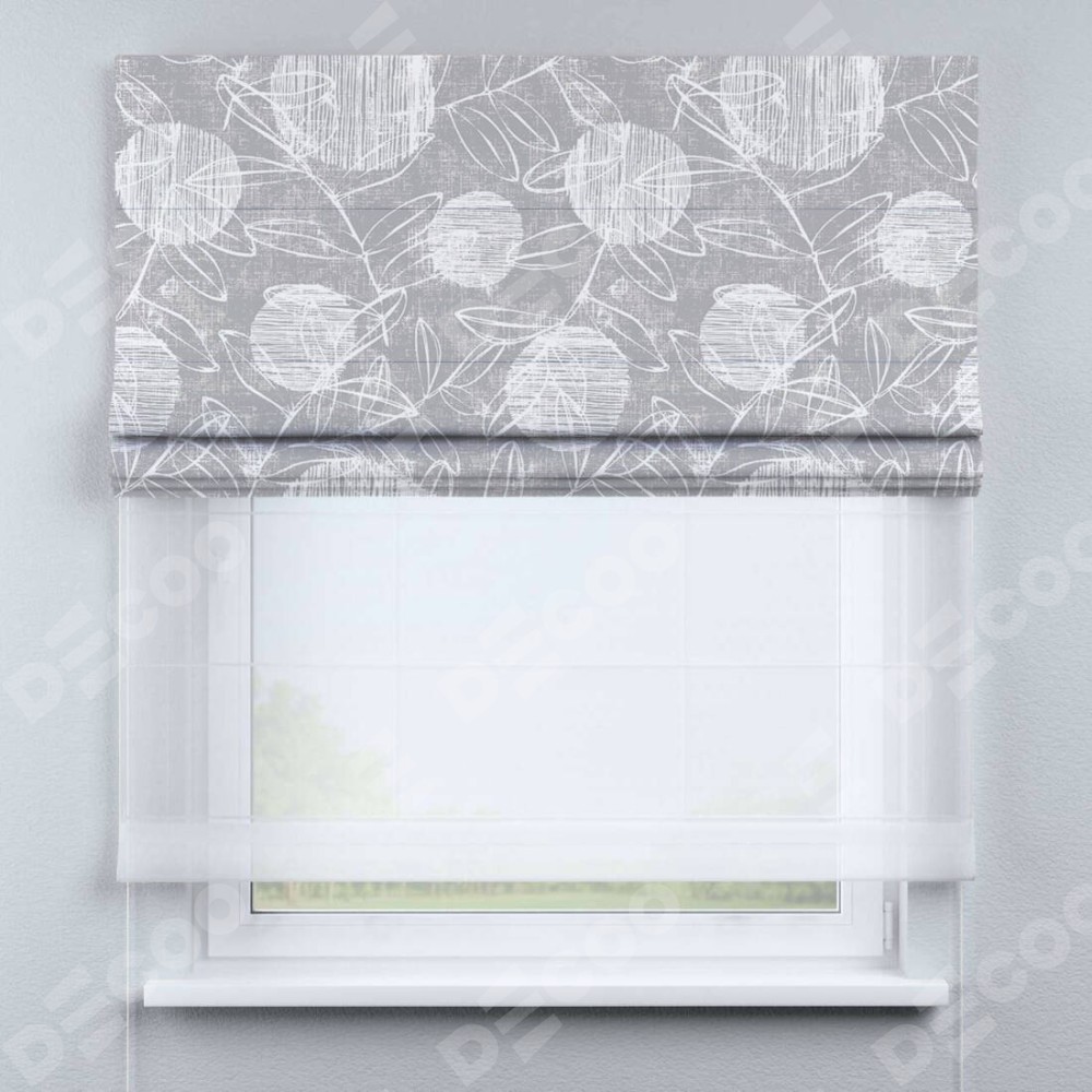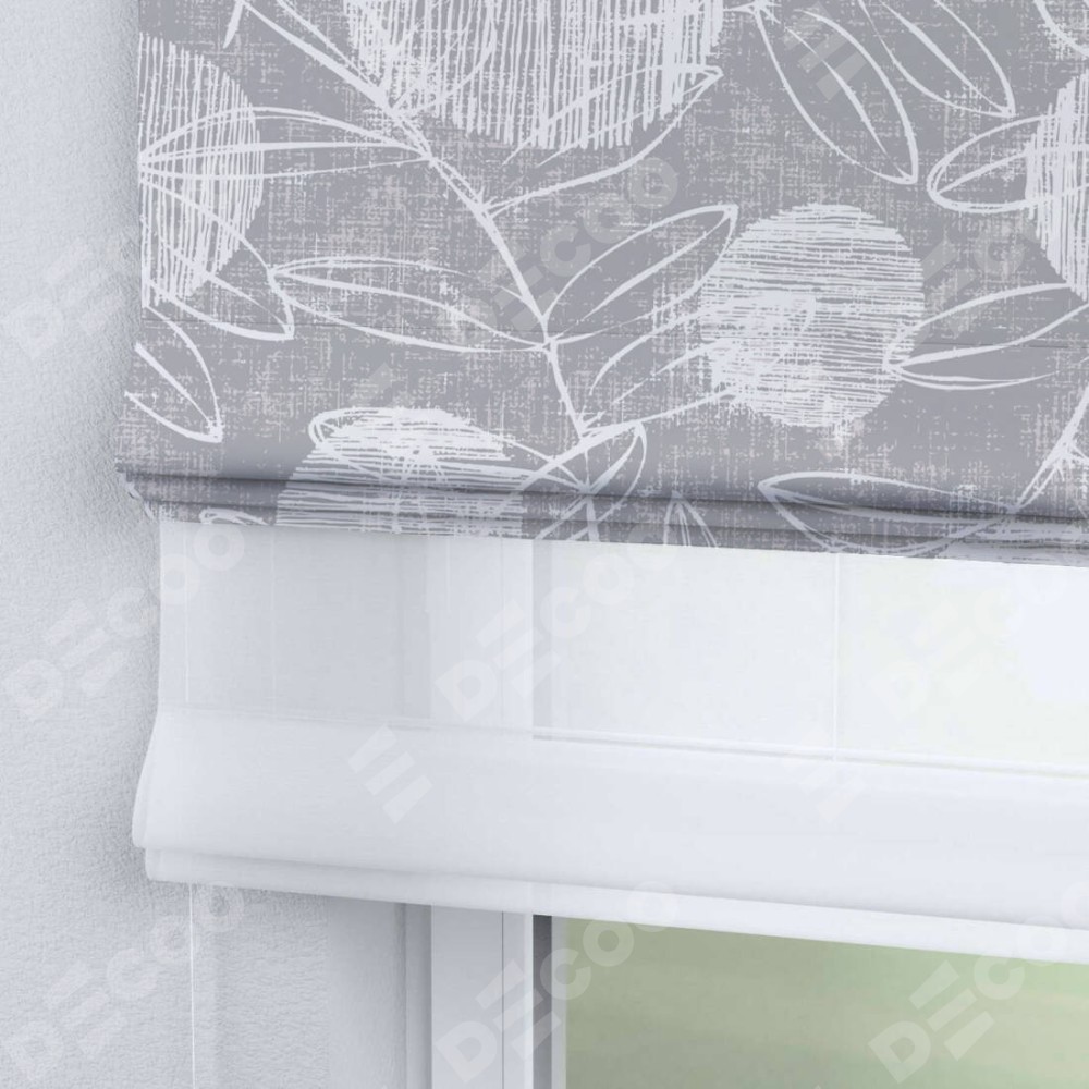 Римская штора день-ночь производителя «Cortin», используется для проёма, пошита из двух полотен, с лицевой блэкаут с нанесением сублимационной печати «Серо-белая фантазия», вторая ткань тюль (по стандарту комплектуется тюль белого цвета артикул V-01). Имеет универсальный механизм и подходит для монтажа: на потолок, на стену и в нишу.