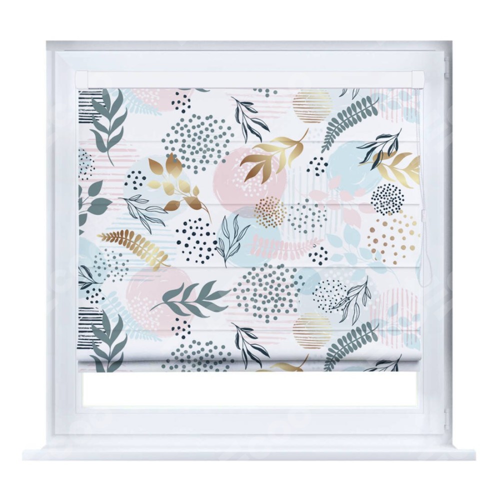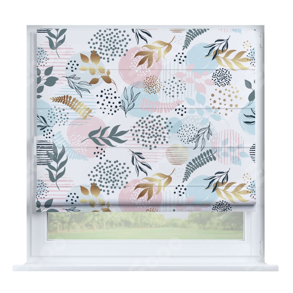 Римская штора производителя «Cortin», устанавливается на створку окна, пошита из ткани блэкаут с нанесением сублимационной печати «Точки и листочки». Штора шьётся по индивидуальным размерам, для данного типа римской шторы возможная ширина от 35 до 150 см., высота до 250 см.