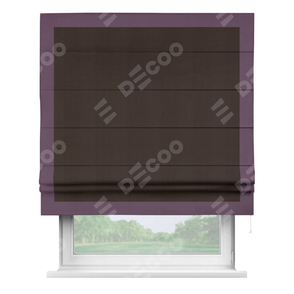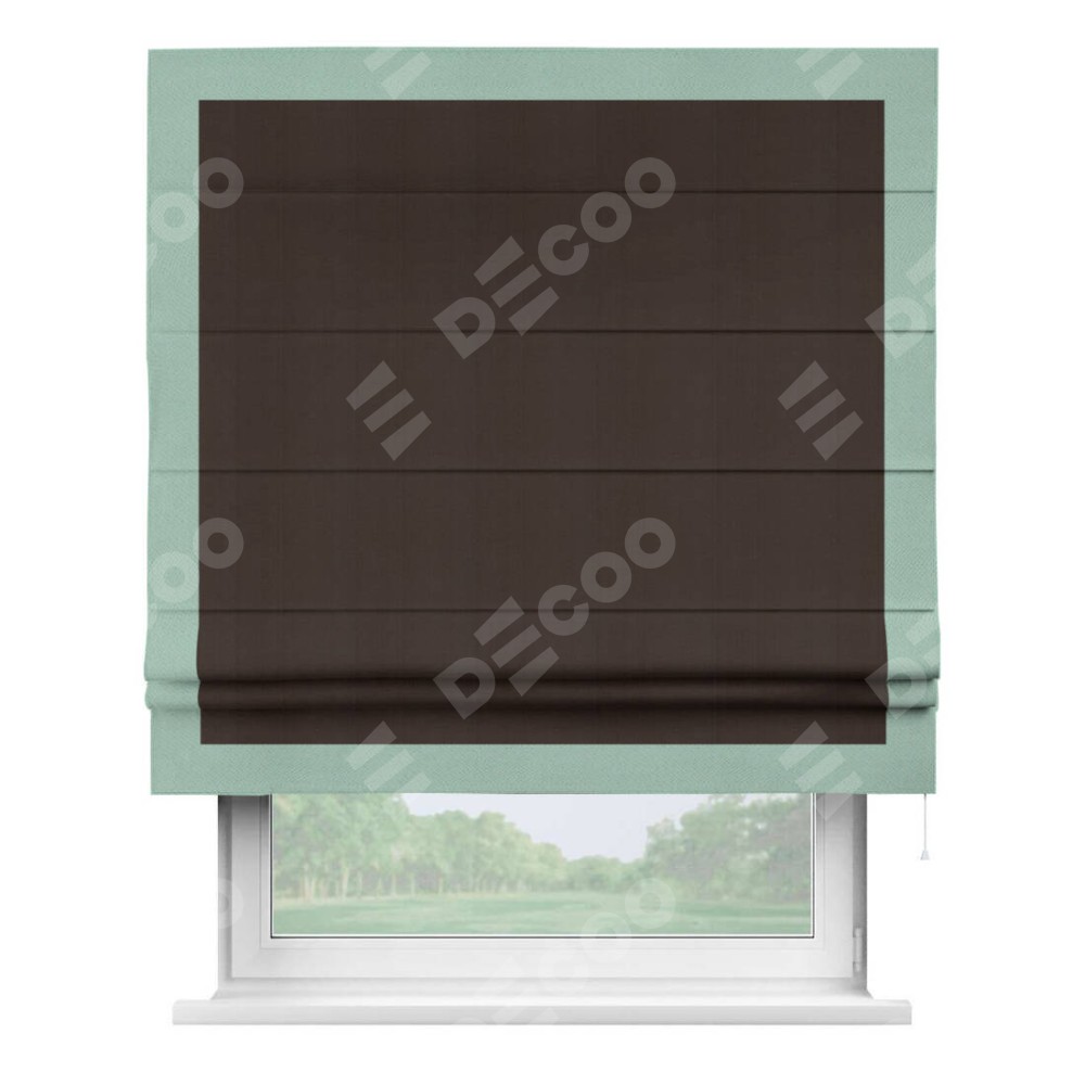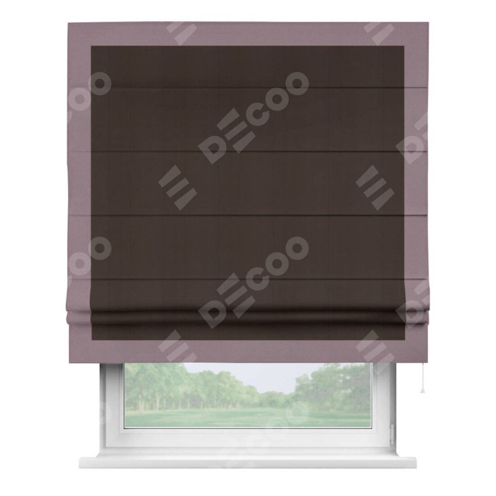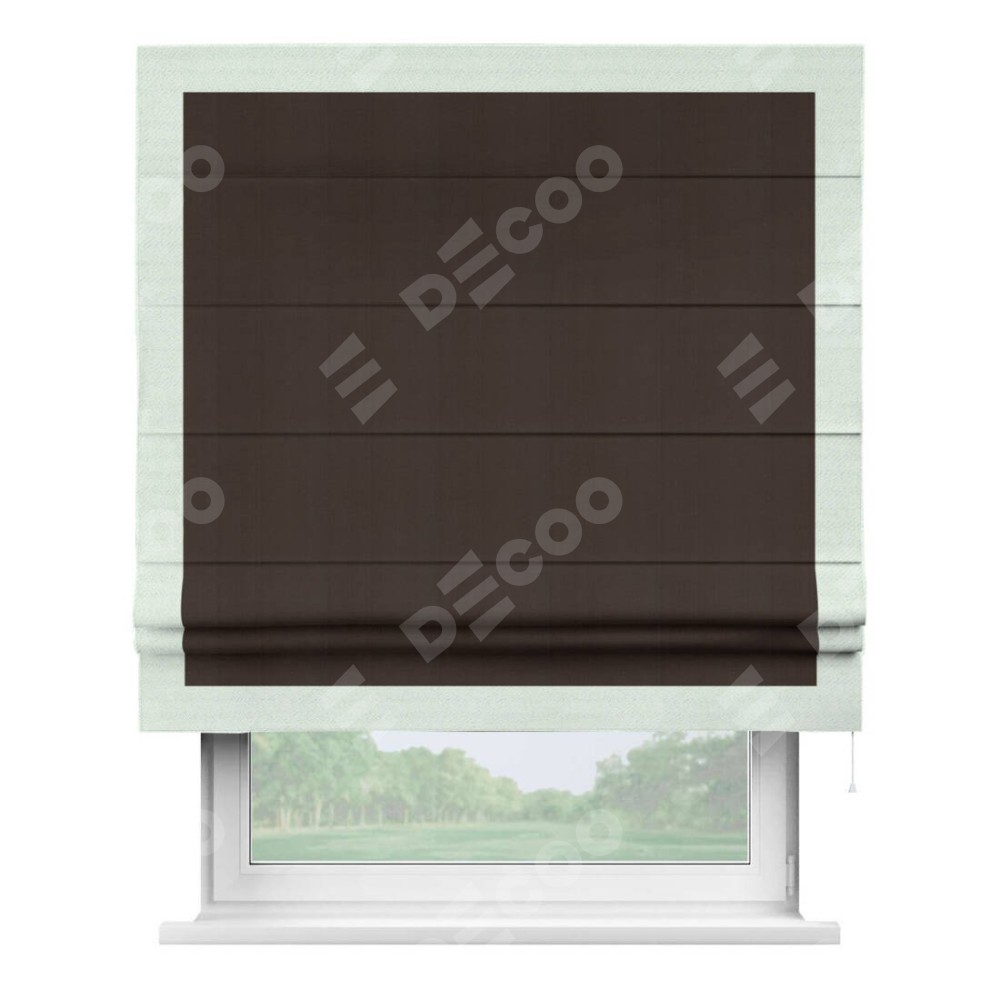 Римская штора производителя «Cortin», используется для проёма, пошита из ткани блэкаут однотонный тёмно-коричневый, артикул ткани 88287. Отделка шторы кантом «Чесс», ткань для канта используется из блэкаута однотонного разной расцветки на выбор. Имеет универсальный механизм и подходит для монтажа: на потолок, на стену и в нишу.