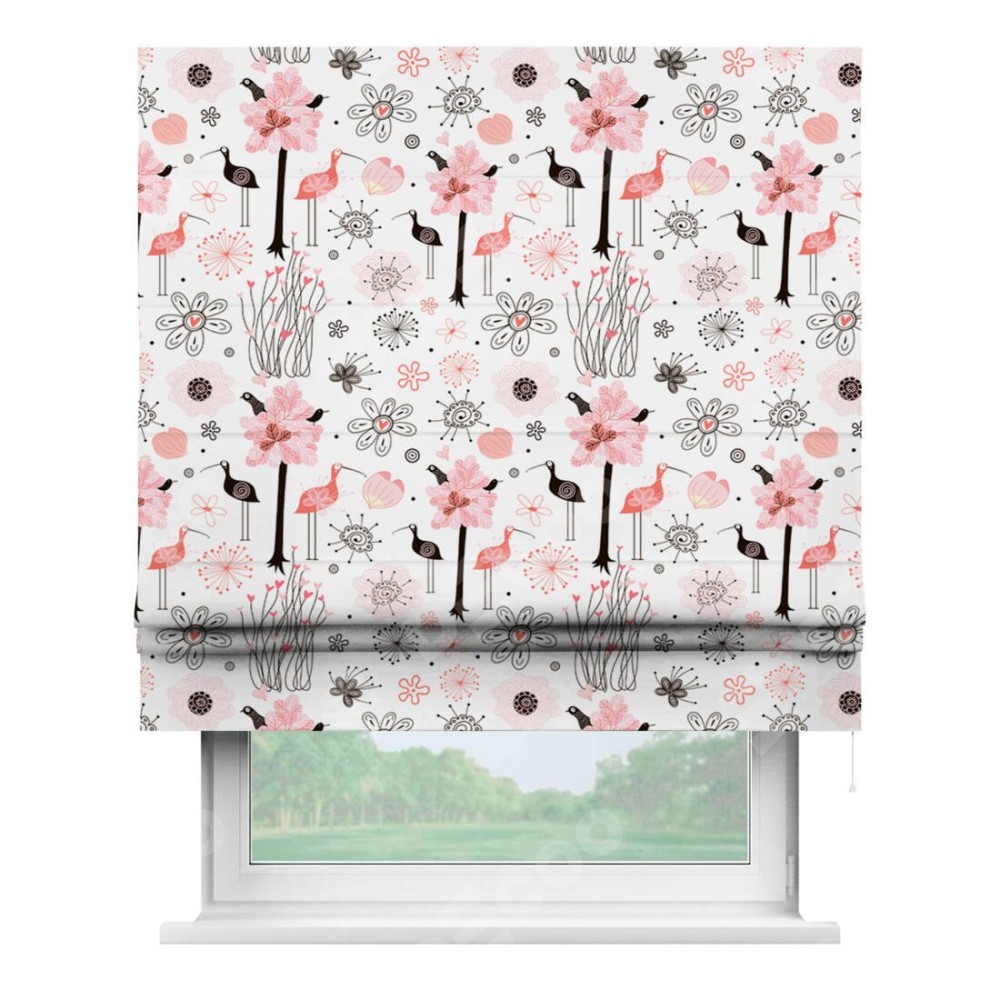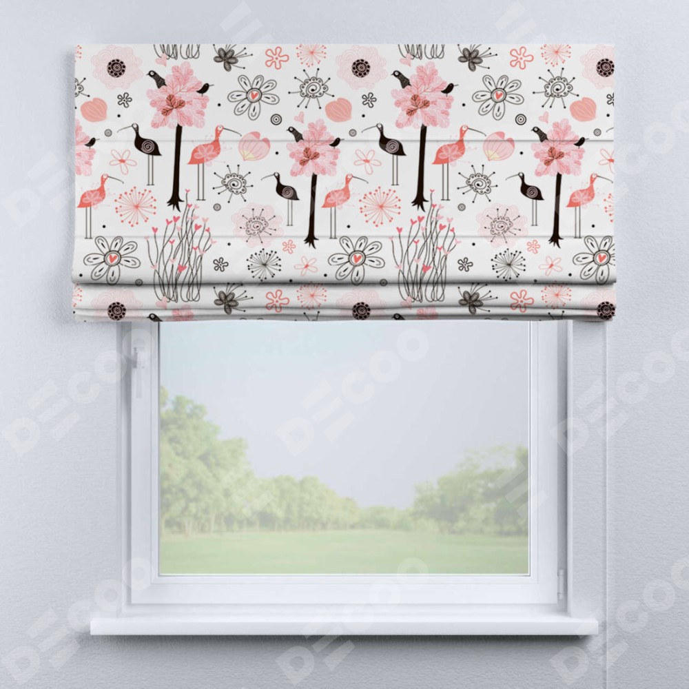 Римская штора производителя «Cortin», используется для проёма, пошита из ткани блэкаут с нанесением сублимационной печати «Любопытные птички». Имеет универсальный механизм и подходит для монтажа: на потолок, на стену и в нишу.