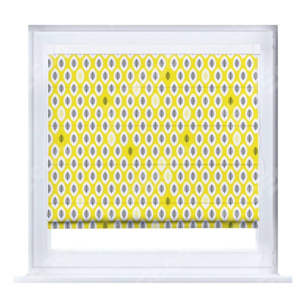 Римская штора производителя «Cortin», устанавливается на створку окна, пошита из ткани блэкаут с нанесением сублимационной печати «Солнечные листья». Штора шьётся по индивидуальным размерам, для данного типа римской шторы возможная ширина от 35 до 150 см., высота до 250 см.