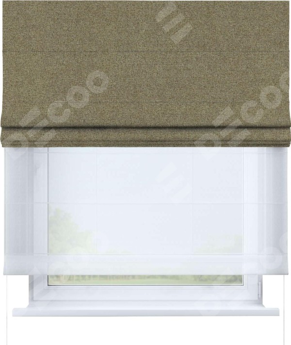 Римская штора день-ночь производителя «Cortin», используется для проёма, пошита из двух полотен, с лицевой стороны лён блэкаут бежевый артикул 69435, вторая ткань тюль (по стандарту комплектуется тюль белого цвета артикул V-01). Имеет универсальный механизм и подходит для монтажа: на потолок, на стену и в нишу.