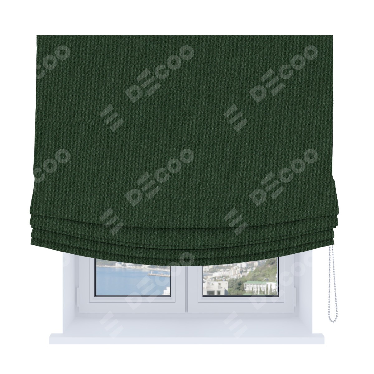 Римская штора Soft производителя «Cortin», используется для проёма, пошита из ткани лён блэкаут зелёный, артикул ткани 69497. Имеет универсальный механизм и подходит для монтажа: на потолок, на стену и в нишу. В отличие от стандартных римских штор, римская штора Soft не имеет горизонтальных вставок и нижнего отвеса. Это позволяет ткани произвольно драпироваться в свободные мягкие складки.