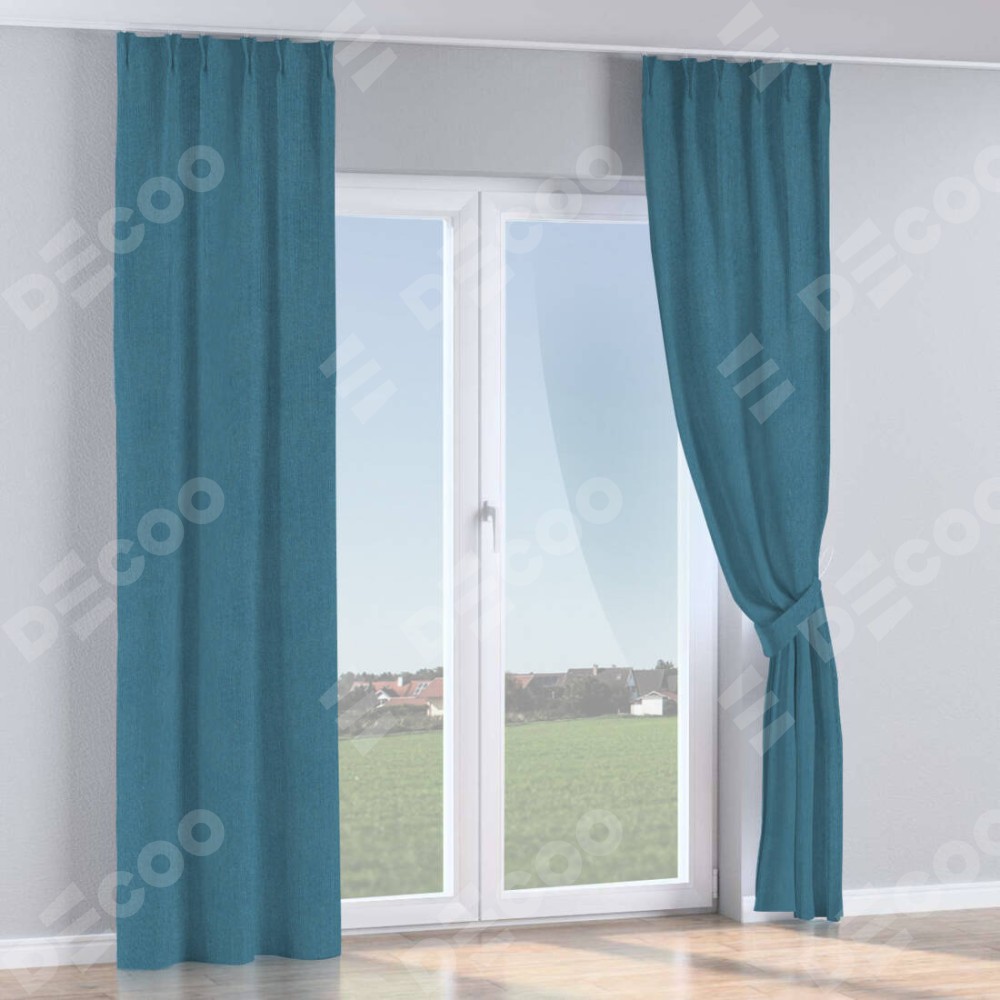 Комплект прямых штор, от производителя «Cortin», пошиты из ткани лён блэкаут синий, артикул ткани 69528. С изнаночной стороны в верхней части штор пристрачивается шторная лента с декоративными складками «Кустик». Для создания элегантных складок прямые шторы шьются по стандарту с коэффициентом 1:2 (на 100 см. ширины проёма 200 см. ширины ткани).