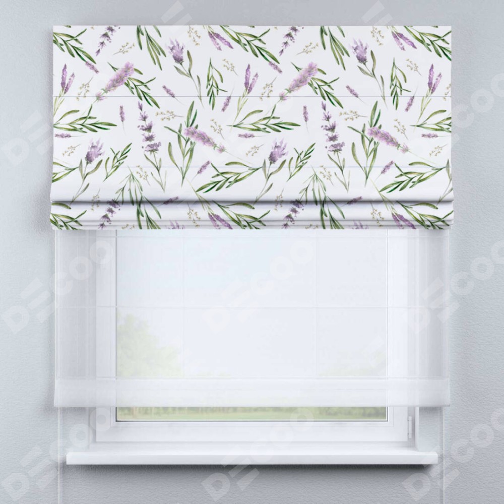Римская штора день-ночь производителя «Cortin», используется для проёма, пошита из двух полотен, с лицевой блэкаут с нанесением сублимационной печати «Лавандовое поле», вторая ткань тюль (по стандарту комплектуется тюль белого цвета артикул V-01). Имеет универсальный механизм и подходит для монтажа: на потолок, на стену и в нишу.
