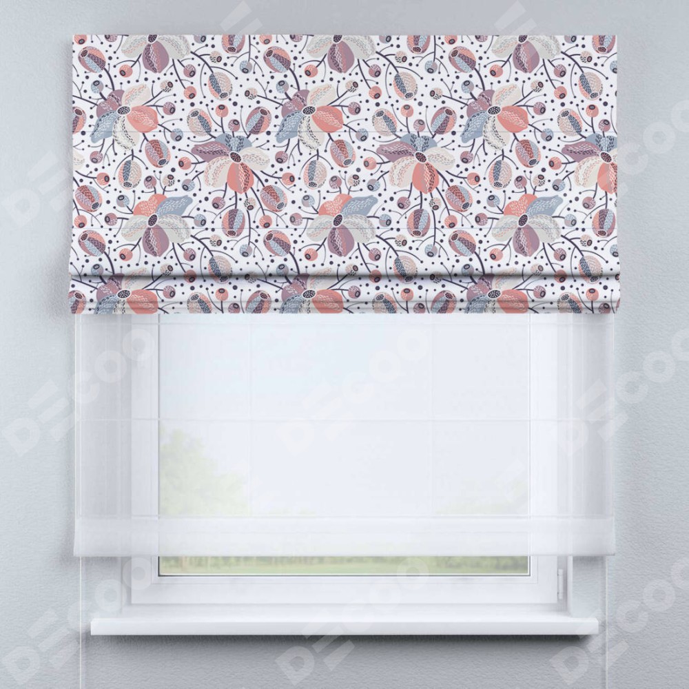 Римская штора день-ночь производителя «Cortin», используется для проёма, пошита из двух полотен, с лицевой блэкаут с нанесением сублимационной печати «Цветочный микс», вторая ткань тюль (по стандарту комплектуется тюль белого цвета артикул V-01). Имеет универсальный механизм и подходит для монтажа: на потолок, на стену и в нишу.
