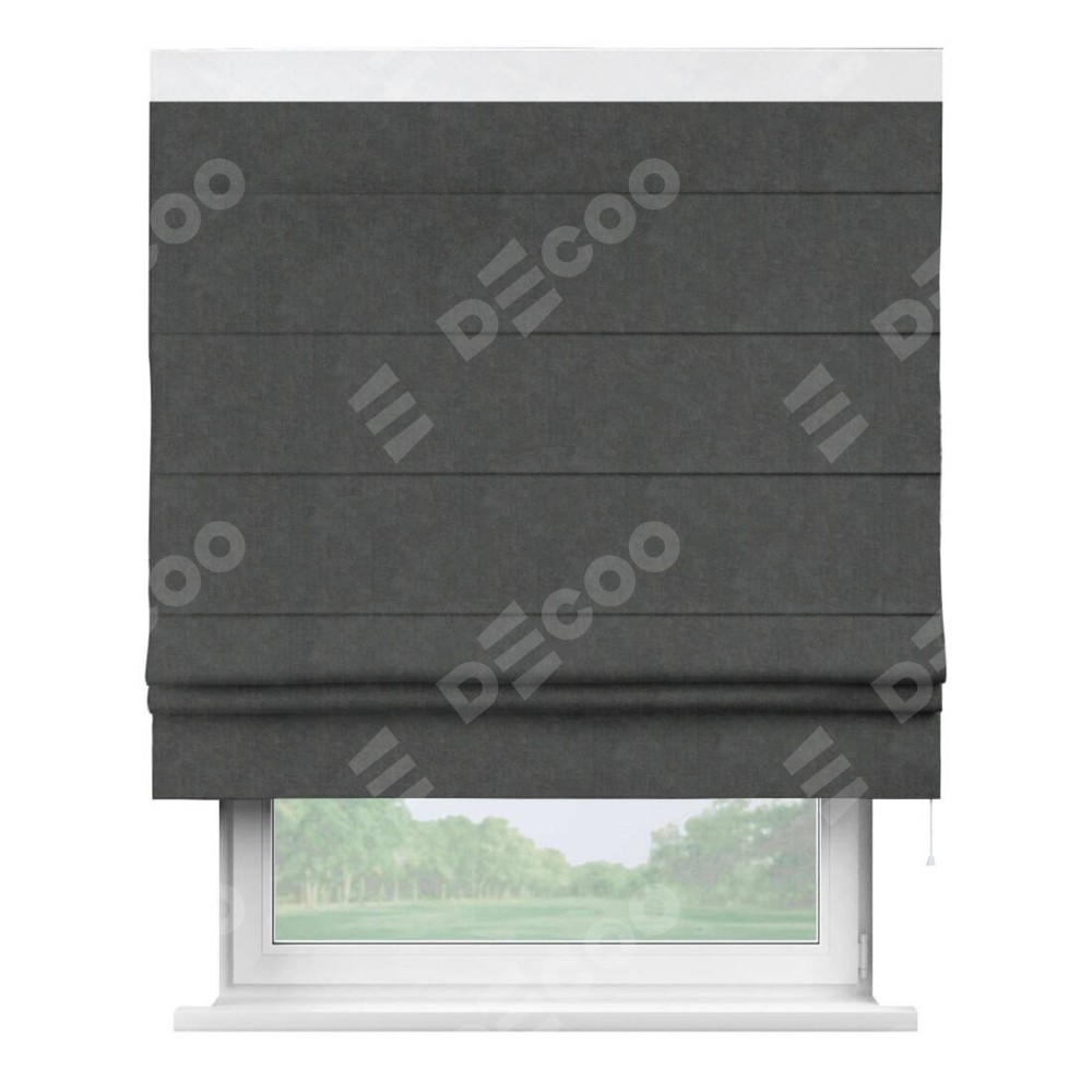 Римская штора производителя «Cortin», используется для проёма, пошита из ткани вельвет тёмно-серый, артикул ткани 33811. Отделка шторы кантом «Кинг», ткань для канта используется из вельвета разной расцветки на выбор. Имеет универсальный механизм и подходит для монтажа: на потолок, на стену и в нишу.